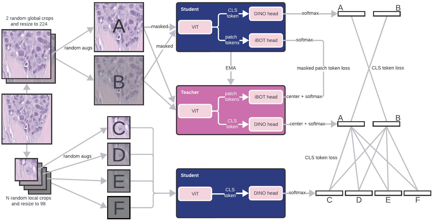 Extended Data Fig. 2 | Schematic of the DINOv2 training routine. Virchow used a ViT-H architecture, trained with DINOv2. From a single tile, 2 global crops and 8 local crops all with random augmentations are created. The global crops are randomly masked and fed to the student model, and the unmasked versions are fed to the teacher model. The student tries to produce a global representation of the views (via the CLS token) that matches the teacher’s representation of the