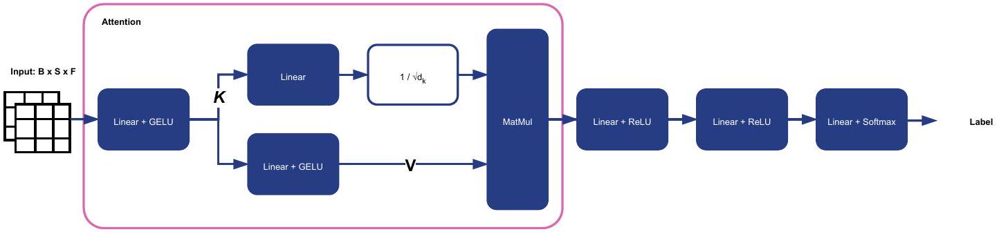 Indeed, full self-attention is quadratic in memory with respect to the number of tiles whereas the attention in Agata is linear. K and V are obtained with two consecutive Gaussian Error Linear Unit (GELU) projection layers as: and , where x is the tile embedding, and are the weight and bias parameters for the projection layers. In our experiments, produces 256 -dimensional keys, produces 512 -dimensional values, and we omit scaling by . After the attention step, two linear layers with non-linear activation (ReLU) are used followed by a final linear layer with softmax activation.
