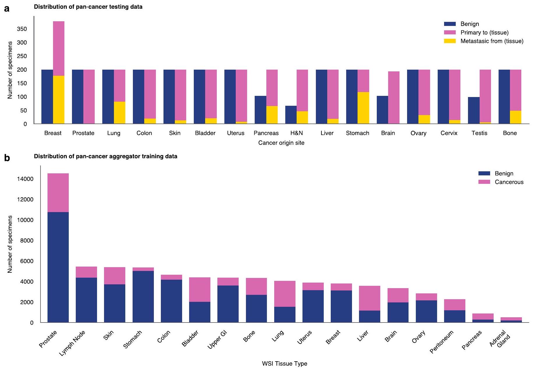 Extended Data Fig. 4 | Pan-cancer dataset distribution. a. Specimen counts per cancer origin site in the pan-cancer testing dataset ( is head and neck). b. Specimen counts per tissue type in the pan-cancer aggregator training dataset.