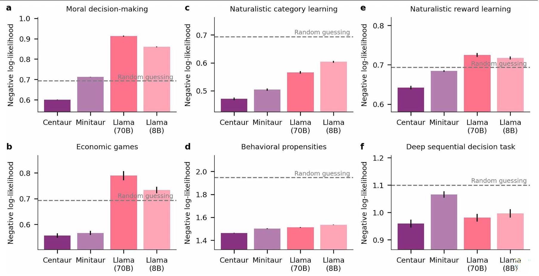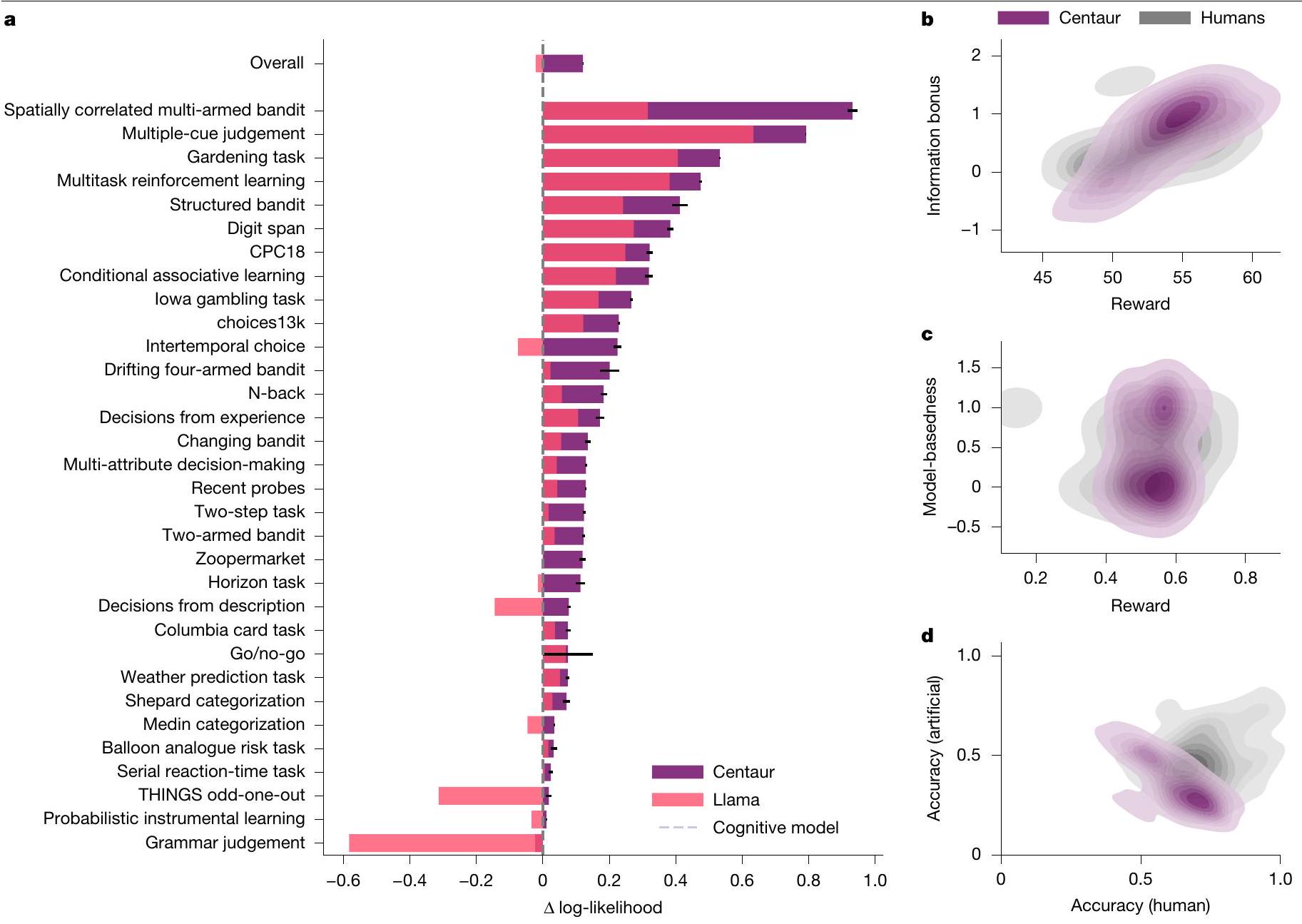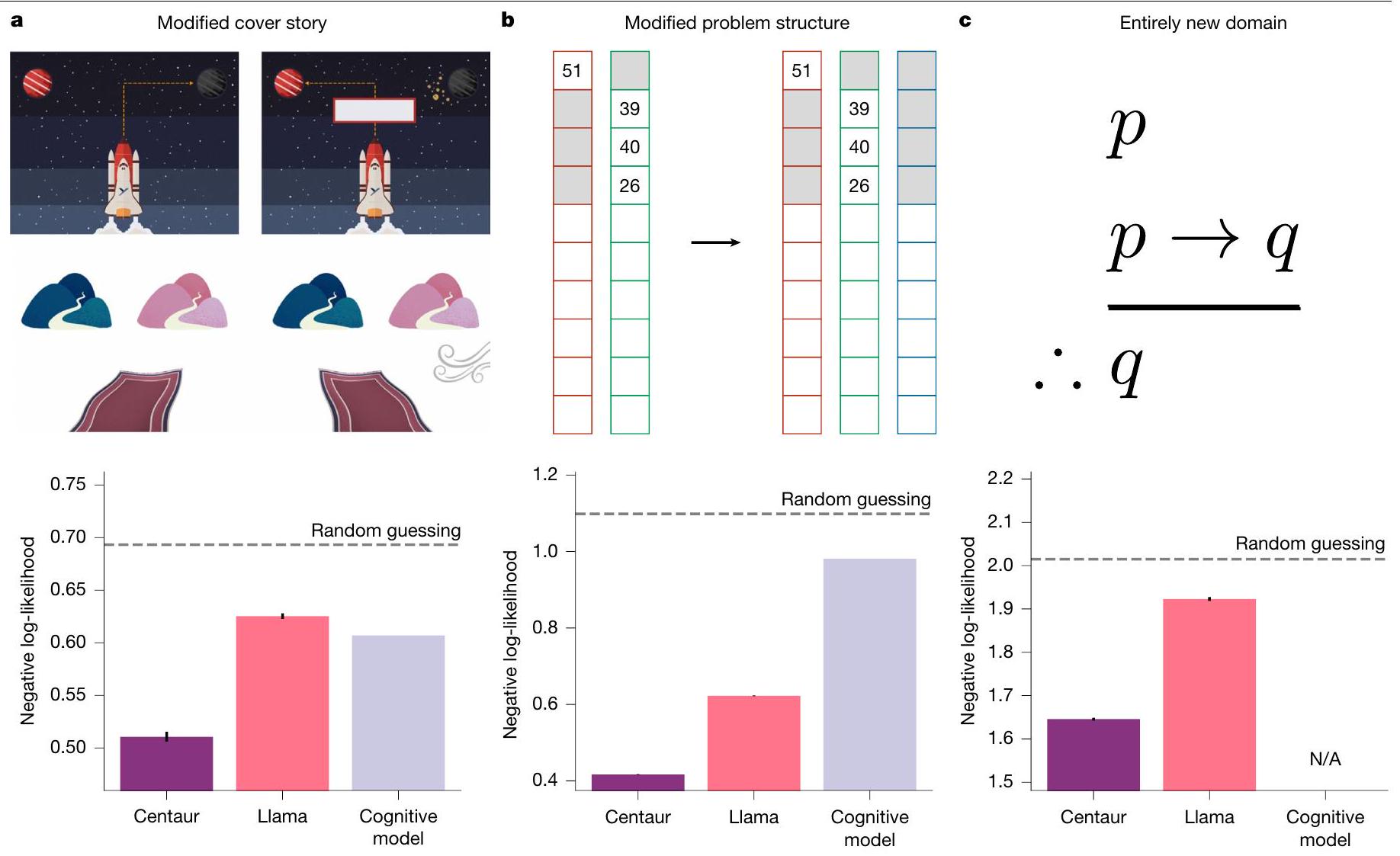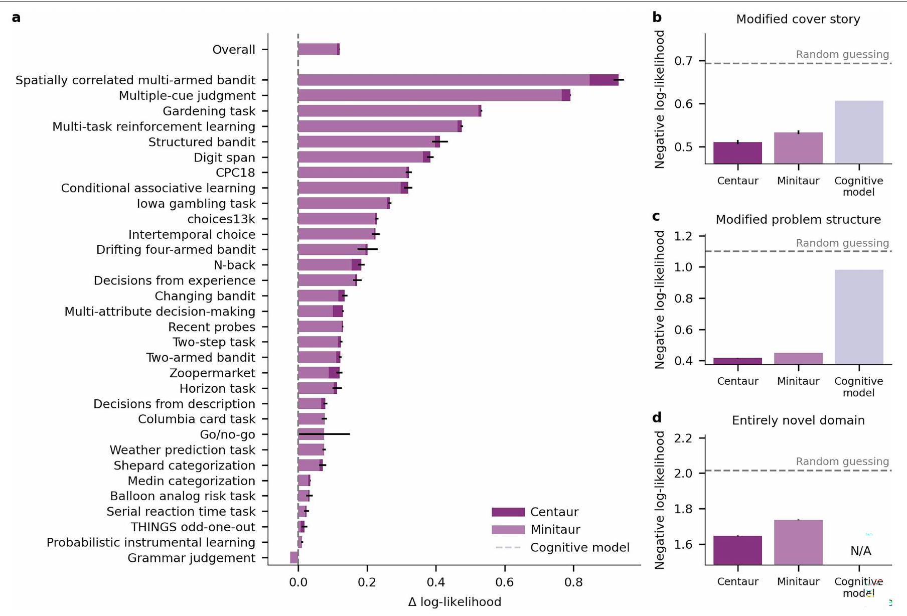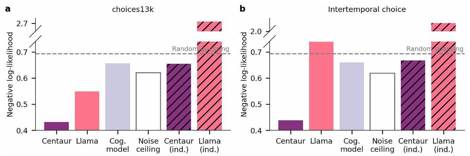Institute for Human-Centered AI, Helmholtz Center, Munich, Germany. University of Tübingen, Tübingen, Germany. University of Oxford, Oxford, UK. Max Planck Institute for Biological Cybernetics, Tübingen, Germany. New York University, New York, NY, USA. Google DeepMind, London, UK. Princeton University, Princeton, NJ, USA. Max Planck School of Cognition, Leipzig, Germany. University of California, San Diego, San Diego, CA, USA. Boston University, Boston, MA, USA. TU Darmstadt, Darmstadt, Germany. Institute of Computational Biology, Helmholtz Center, Munich, Germany. TUM School of Computation, Information and Technology, Technical University of Munich, Munich, Germany. TUM School of Life Sciences, Technical University of Munich, Munich, Germany. University of Cambridge, Cambridge, UK. Georgia Institute of Technology, Atlanta, GA, USA. University of Basel, Basel, Switzerland. Max Planck Institute for Human Development, Berlin, Germany. e-mail: marcel.binz@helmholtz-munich.de - Full negative log-likelihoods on held-out participants.