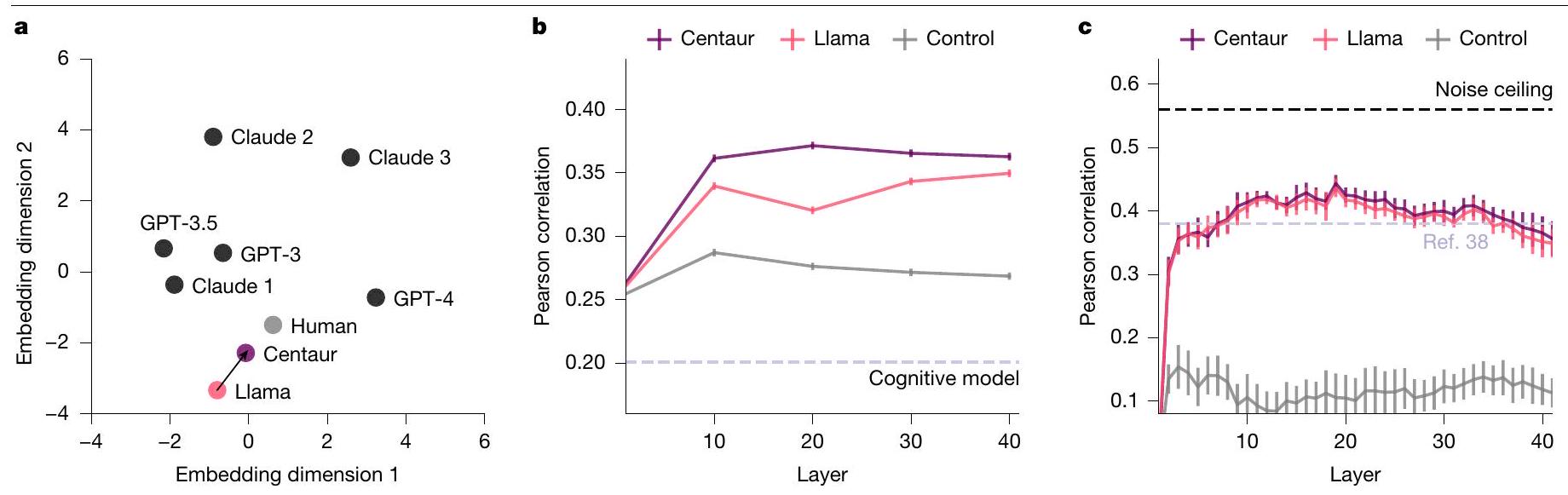 التعلم تحت الإشراف، عمليات اتخاذ القرار ماركوف وغيرها (تم تنسيق الأمثلة المعروضة واختصارها لسهولة القراءة). ب، سنتور هو نموذج أساسي للإدراك البشري يتم الحصول عليه عن طريق إضافة محولات منخفضة الرتبة إلى نموذج لغوي متطور وتحسينه على Psych-101.