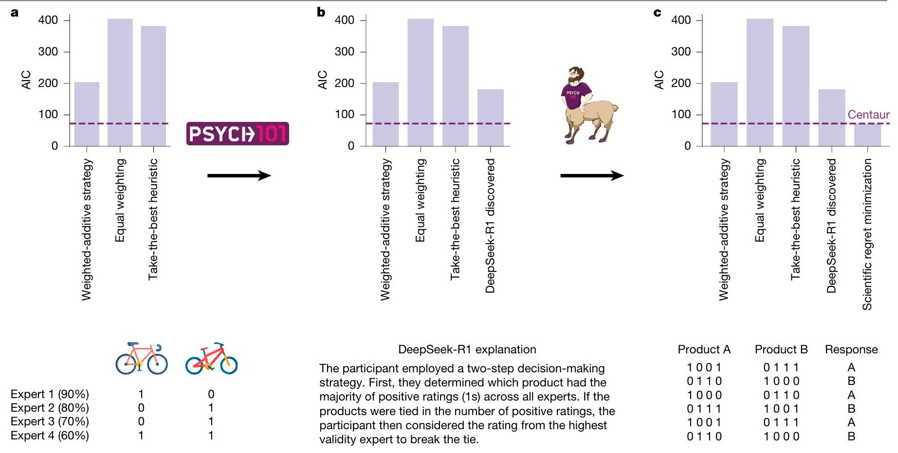 بمشكلات اختار فيها المشاركون الخيار الذي يحتوي على عدد أقل من التقييمات الإيجابية بشكل عام ولكن تم تقييمه بشكل إيجابي من قبل خبير ذو موثوقية أعلى (انظر الشكل 5c لتوضيح هذه المشكلات وطرق، ‘الاكتشاف العلمي الموجه بواسطة النموذج’ لمزيد من التفاصيل). تشير هذه النمطية إلى أن التحول بين الاستراتيجيتين ربما ليس صارمًا كما اقترح في البداية من قبل استراتيجية DeepSeek-R1 المكتشفة. لالتقاط ذلك، استبدلنا قاعدة إما-أو بمتوسط مرجح لكلا الاستراتيجيتين. وجدنا أن النموذج الذي نتج عن هذه العملية يتطابق مع Centaur من حيث جودته (AIC، 71.7) ولكنه لا يزال قابلًا للتفسير. أدخلنا قيم AIC الناتجة لجميع النماذج في إجراء اختيار نموذج على مستوى المجموعة