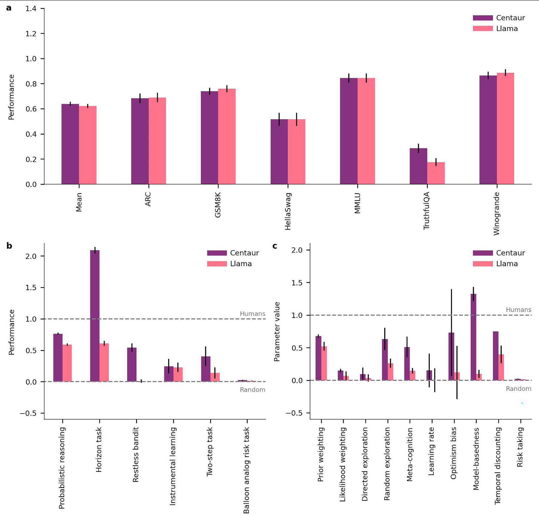(ومع ذلك، يحتوي على تجارب متعددة الأذرع مع أكثر من ثلاثة خيارات للاختيار من بينها). وبالتالي، توفر هذه التحليل اختبارًا لصلابة Centaur تجاه التعديلات الهيكلية في المهام. وجدنا أن Centaur التقط سلوك الإنسان في مزرعة ماغي، كما هو موضح في الشكل 3ب. مرة أخرى، لاحظنا فائدة من الضبط الدقيق، بالإضافة إلى ملاءمة جيدة مقارنةً بنموذج إدراكي محدد المجال، الذي لم يتعمم بشكل جيد في هذا الإعداد (الاحتمالية السلبية لـ Centaur، 0.42؛ الاحتمالية السلبية لـ Llama، 0.62؛ الاحتمالية السلبية للنموذج الإدراكي، 0.98؛ جانب واحد