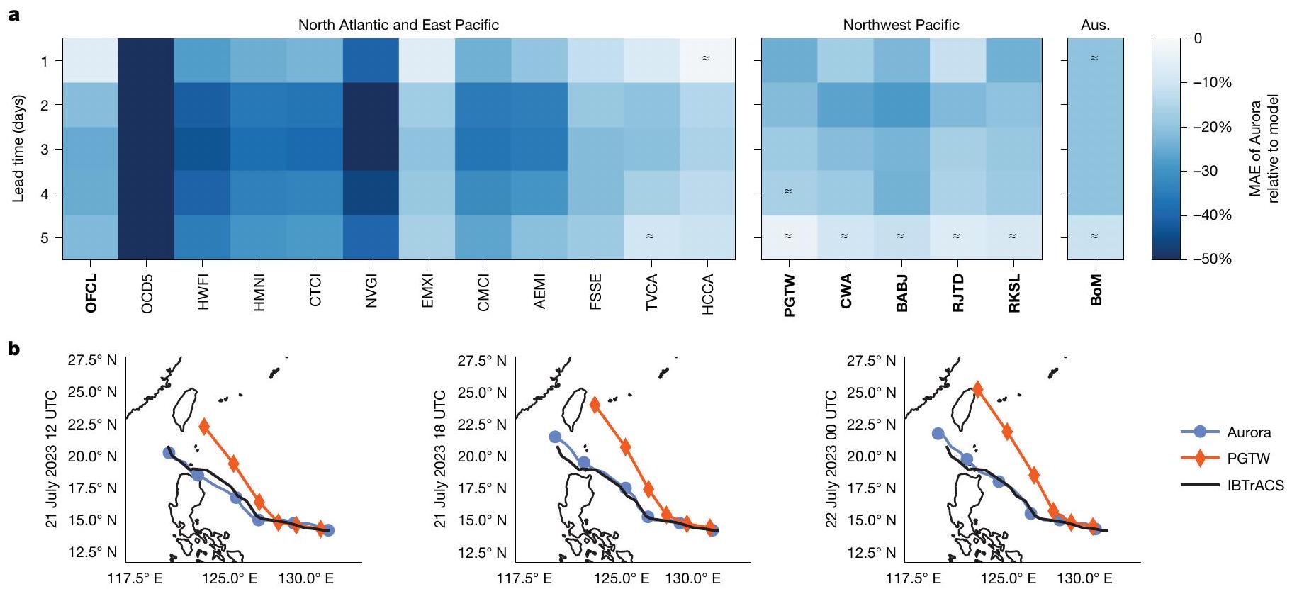 الدقة، متجاوزة النماذج العددية المكلفة على من الأهداف؛ - تنبؤات مسار الأعاصير الاستوائية لمدة 5 أيام، متفوقة على سبعة مراكز للتنبؤ التشغيلي على 100% من الأهداف؛