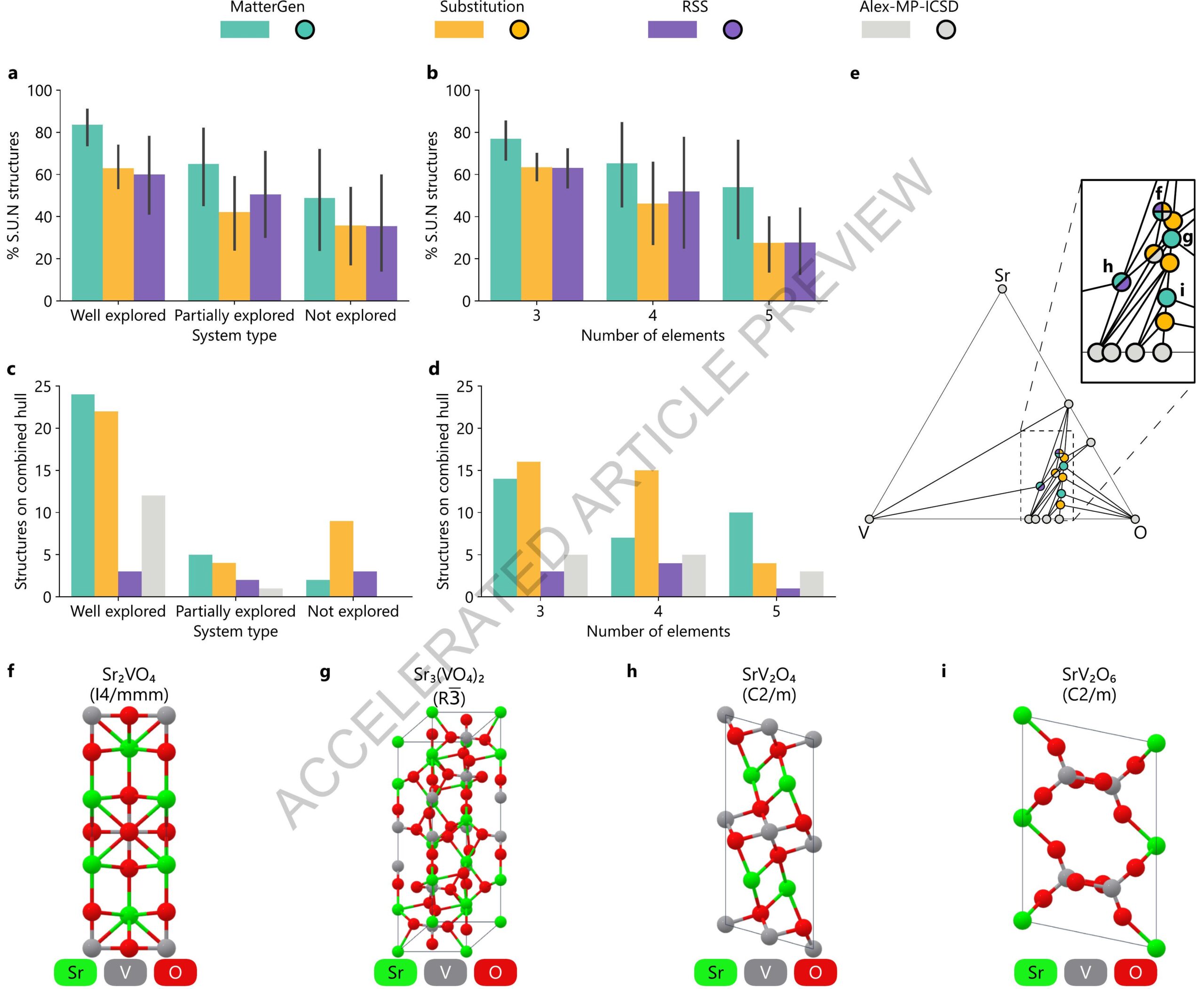 be realized with generative models by proposing better initial candidates. Finally, we show that MatterGen finds three novel (four overall) structures on the combined hull for V-Sr-O-an example of a well-explored ternary system-while substitution finds three (five overall), and RSS only one (two overall) (Fig. 3(e)). Structures discovered by MatterGen are shown in Fig. 3(f-i), and are analyzed in Supplementary D.6.2.