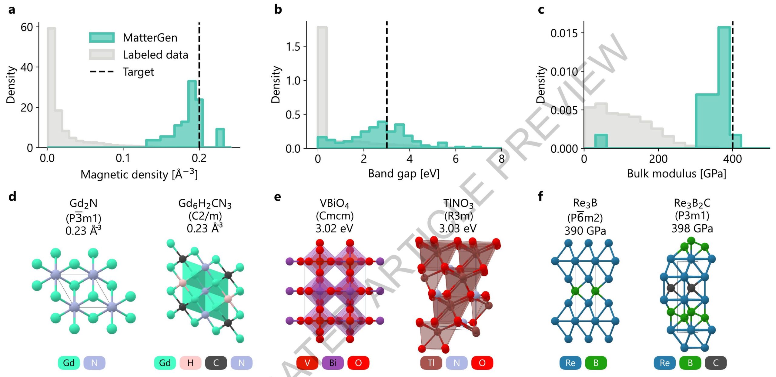 MatterGen أكثر من ضعف احتمالية أن تكون جديدة ومستقرة، وأكثر من 10 مرات أقرب إلى الحد الأدنى للطاقة المحلية. بعد الضبط الدقيق، يقوم MatterGen بنجاح بتوليد مواد مستقرة وجديدة ذات كيمياء مرغوبة، تماثل، بالإضافة إلى خصائص ميكانيكية وإلكترونية ومغناطيسية. كدليل على المفهوم، نقوم بتخليق أحد الهياكل المولدة ونقيس قيمة خاصيته لتكون ضمن
