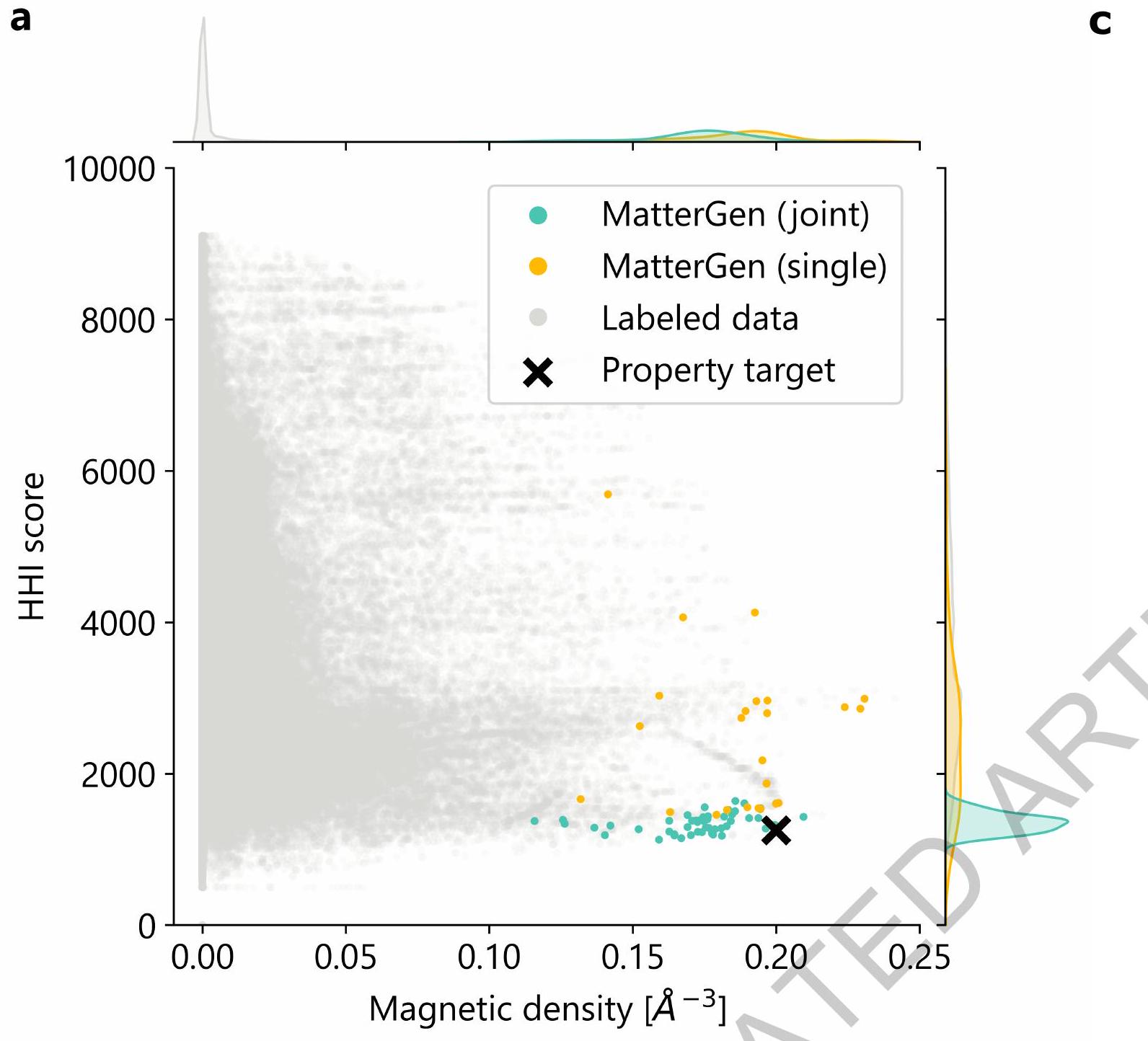 mمكن تصميم المواد العكسية لمجموعة أوسع بكثير من المشكلات مقارنة بالنماذج التوليدية السابقة. عند الضبط الدقيق، غالبًا ما ينتج MatterGen المزيد من المواد S.U.N. في الأنظمة الكيميائية المستهدفة مقارنةً بالطرق المعروفة مثل الاستبدال والبحث عن الهياكل العشوائية (RSS) (الشكل 3)، وهو قادر على توليد هياكل متجانسة للغاية نظرًا لمجموعات الفضاء المرغوبة (الشكل D8)، وينتج مباشرةً مواد S.U.N. تلبي قيود الخصائص الميكانيكية والإلكترونية والمغناطيسية المستهدفة (الشكل 4). كما أن MatterGen قادر على تصميم مواد وفقًا لعدة قيود خصائص، على سبيل المثال، كثافة مغناطيسية عالية وتركيب كيميائي مع مخاطر منخفضة في سلسلة التوريد (الشكل 5). كدليل على المفهوم، نتحقق من قدرات تصميم MatterGen من خلال تخليق مادة مولدة وقياس خاصيتها لتكون ضمن