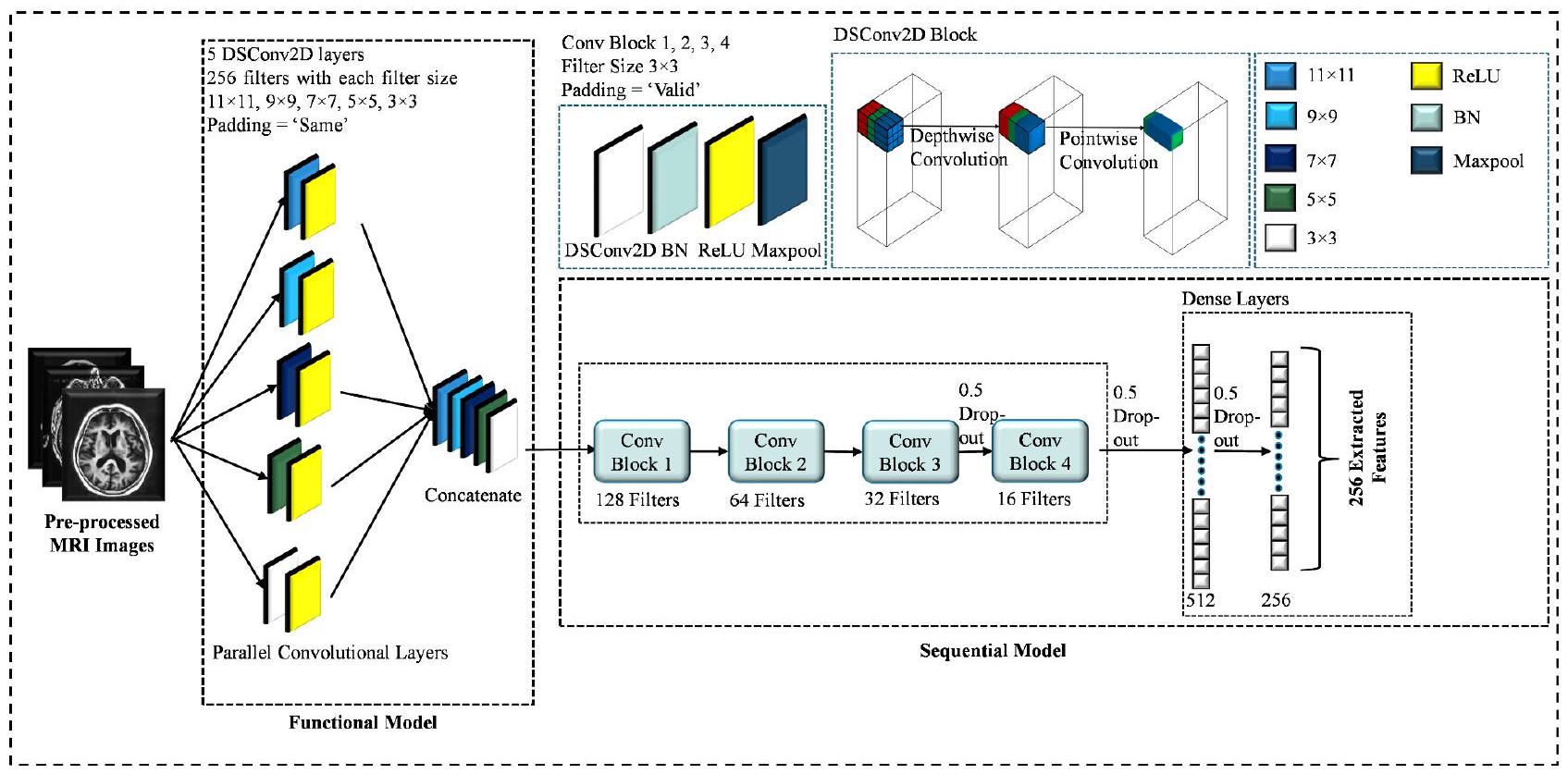 - تم اقتراح شبكة عصبية تلافيفية قابلة للفصل بعمق خفيف الوزن (PDSCNN) لاستخراج الميزات ذات الصلة من صور الرنين المغناطيسي المحسنة. يلتقط هذا النموذج الأنماط المحددة للورم بكفاءة مع تقليل التعقيد الحسابي.