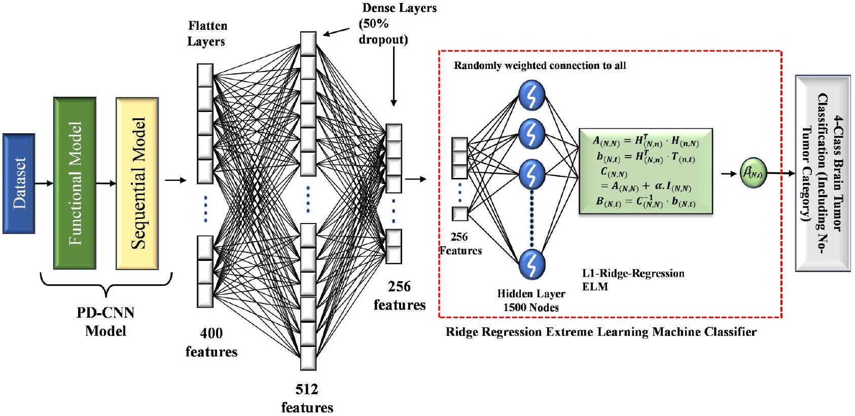 تشكل أورام الدماغ تحديًا صحيًا عالميًا كبيرًا، ويعد الكشف المبكر عنها وتصنيفها بدقة أمرًا حيويًا لاستراتيجيات العلاج الفعالة. تقدم هذه الدراسة نهجًا جديدًا يجمع بين شبكة عصبية تلافيفية قابلة للفصل بعمق خفيف الوزن (PDSCNN) ونموذج هجين من الانحدار الجبهي (RRELM) لتصنيف أربعة أنواع من أورام الدماغ (غليوما، منينجيوما، لا ورم، وغدة نخامية) بناءً على صور الرنين المغناطيسي. يعزز النهج المقترح وضوح وشفافية ميزات الورم في صور الرنين المغناطيسي من خلال استخدام تعديل تباين الهيستوغرام التكيفي المحدود (CLAHE). ثم يتم استخدام PDSCNN خفيف الوزن لاستخراج الأنماط المحددة للورم مع تقليل التعقيد الحسابي. يتم اقتراح نموذج هجين من RRELM، مما يعزز ELM التقليدي لتحسين أداء التصنيف. تم مقارنة الإطار المقترح مع نماذج متطورة مختلفة من حيث دقة التصنيف، ومعلمات النموذج، وأحجام الطبقات. حقق الإطار المقترح دقة متوسطة ملحوظة، واسترجاع، وقيم دقة بلغت 99.35%، 99.30%، و99.22%، على التوالي، من خلال التحقق المتقاطع بخمس طيات. تفوق PDSCNN-RRELM على نموذج آلة التعلم المتطرفة مع المعكوس الزائف (PELM) وأظهر أداءً متفوقًا. أدى إدخال الانحدار الجبهي في إطار ELM إلى تحسينات كبيرة في أداء التصنيف ومعلمات النموذج وأحجام الطبقات مقارنة بتلك الخاصة بالنماذج المتطورة. بالإضافة إلى ذلك، تم إثبات قابلية تفسير الإطار باستخدام تفسيرات شابلي التراكمية (SHAP)، مما يوفر رؤى حول عملية اتخاذ القرار وزيادة الثقة في التشخيصات الواقعية.