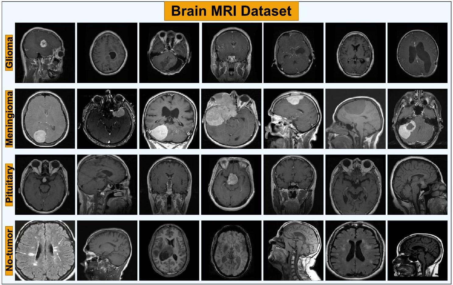 and make precise predictions on unobserved data with a sizable and representative dataset. Ensuring high-quality data is essential to address biases, reduce overfitting or underfitting issues, and improve performance across different subsets. For the autonomous classification of low-grade brain MRI images, several publicly available datasets exist, including Figshare [53], SARTAJ [54], and Br35H [55], which are known to be small-scale datasets. However, in this study, we utilized a publicly accessible brain MRI dataset shared on Kaggle [56], which combines and incorporates these three datasets to reveal the true capabilities of deep learning models on this task. Sample images from this dataset depicting both tumor and healthy cases are illustrated in Fig. 1.