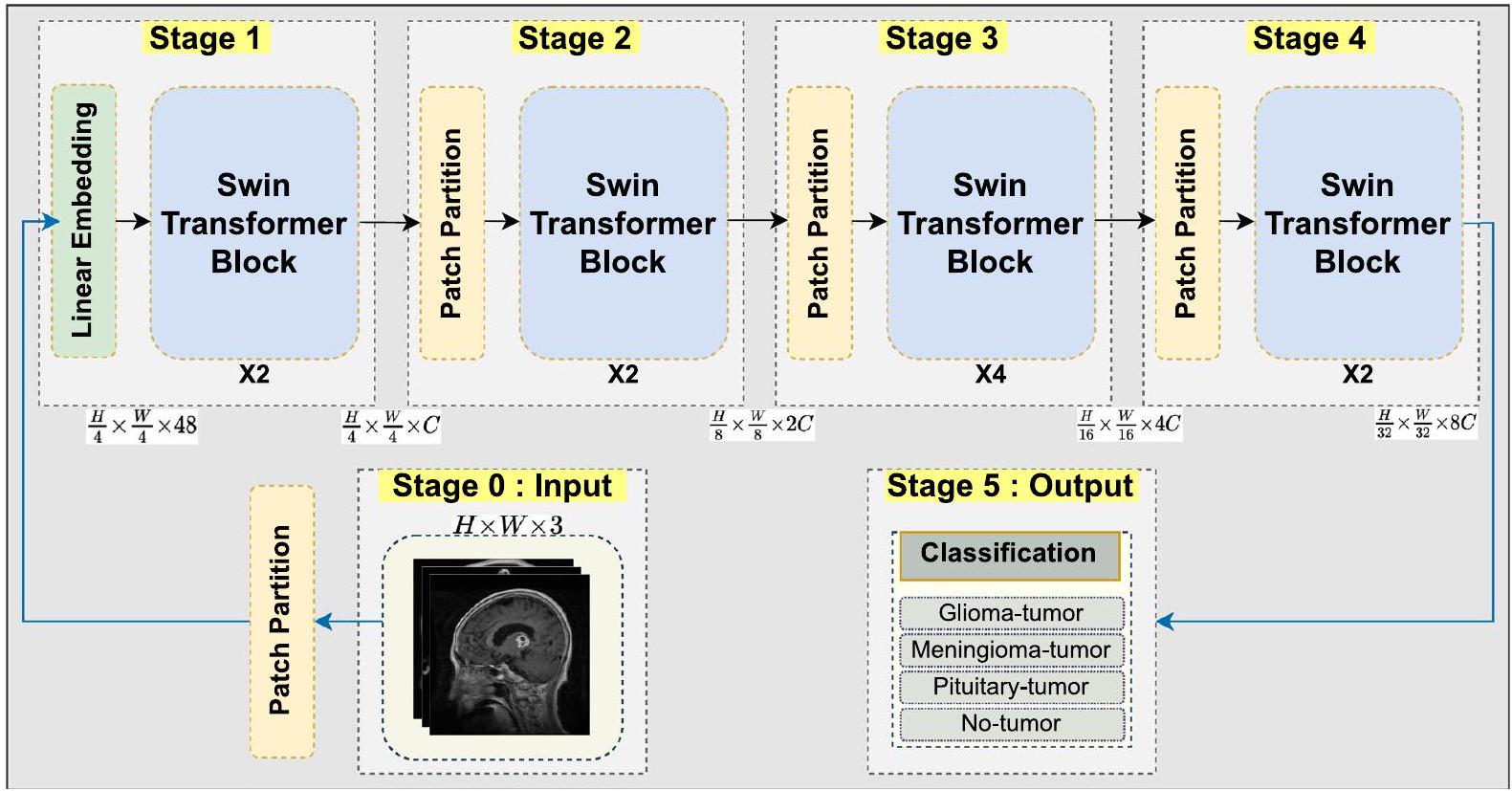 يحتاج إلى تعديل تصميمه ومعاييره لاستيعاب مجموعة متنوعة من أحمال العمل وأحجام مجموعات البيانات. يمكن أن تساعد متغيرات مثل حجم النموذج، وعمق المرحلة، وأبعاد التضمين في تحقيق ذلك. على سبيل المثال، توفر التغييرات الأكبر من Swin Transformer، مثل Swin-Base وSwin-Large، المصممة لمجموعات بيانات مثل ImageNet التي تحتوي على 1000 فئة، سعة محسّنة مناسبة للتعامل مع المهام الأكثر صعوبة ومجموعات البيانات الأكبر. من ناحية أخرى، تنتج نماذج Swin-Small وSwin-Tiny نتائج أكثر فائدة في السيناريوهات التي تحتوي على فئات أقل مع استخدام موارد أقل للمهام الأبسط. يتم توضيح التصميم العام لنموذج Proposed-Swin Transformer لاكتشاف أورام الدماغ في الشكل 2.