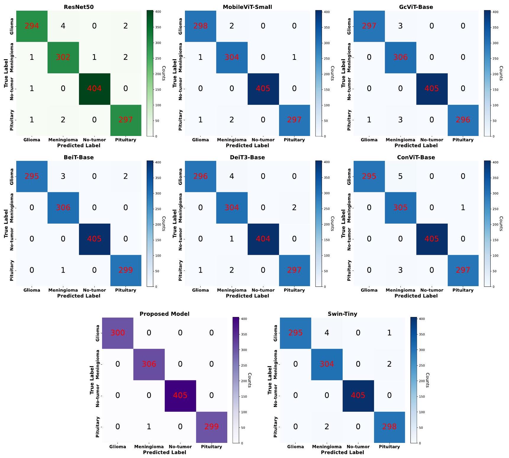 التي حققها نموذج Proposed-Swin، متجاوزة الأبحاث الحالية ونماذج التعلم العميق. تسلط هذه الفعالية الملحوظة الضوء على إمكاناتها للتطبيق العملي في البيئات الواقعية لتشخيص أورام الدماغ بدقة. - بالإضافة إلى ذلك، أظهرنا فعالية نماذج المحولات البصرية الحالية والمحبوبة ونماذج CNN باستخدام مجموعات بيانات الرنين المغناطيسي المتاحة علنًا لتقديم مقارنة شاملة.