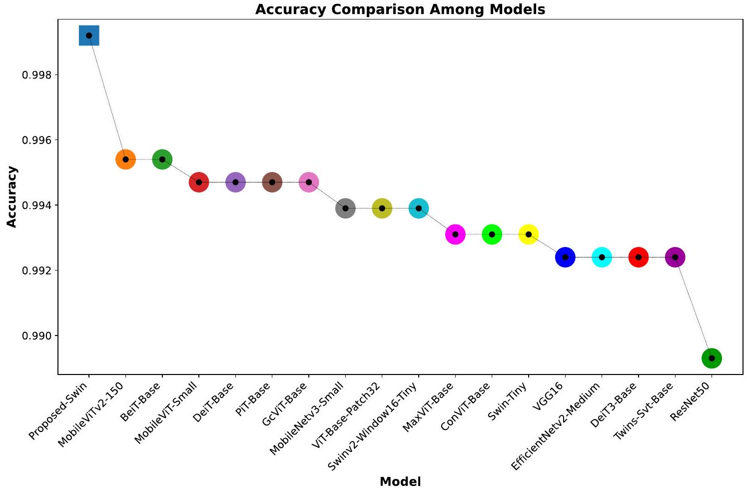 (Proposed-Swin), followed by MobileViTv2-150, BeiTBase, MobileViT-Small, DeiT-Base, with ResNet50 being the least performing model. Notably, the current model, DeiT3, shows lower performance compared to its predecessor, the DeiT model. This underscores the variability in performance that each model can exhibit on medical datasets.