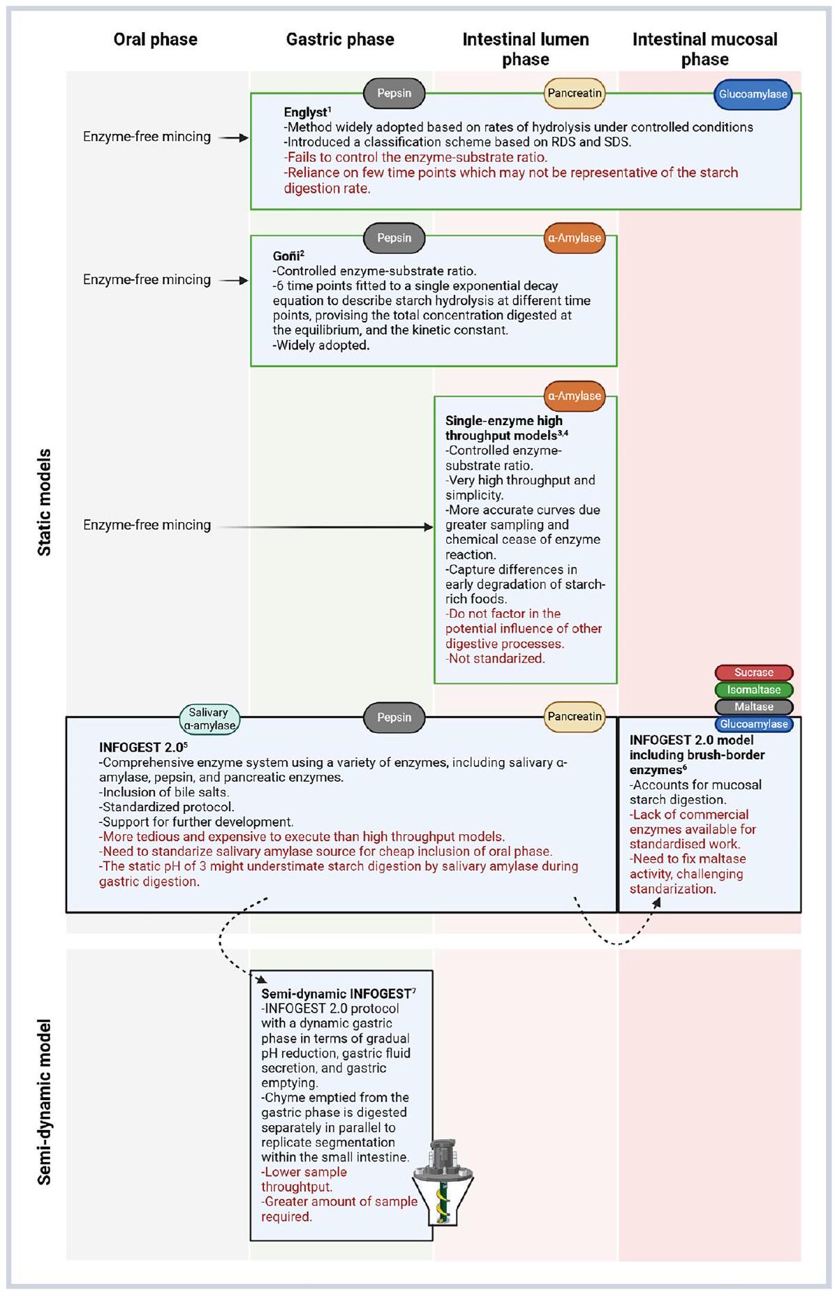 protocols being suggested, with a handful of them becoming widely used, sometimes standardized, and ready to execute using conventional laboratory equipment (Fig. 2). In some cases, carbohydrates are just one of several nutrients assessed in a general digestion model, while other models focus specifically on the digestion of starch. These models differ in important factors such as whether they are static or dynamic, omitting the oral and/or gastric phase, pH , type and concentration of enzymes, duration, inclusion of electrolytes and bile salts (Fig. 2). As our