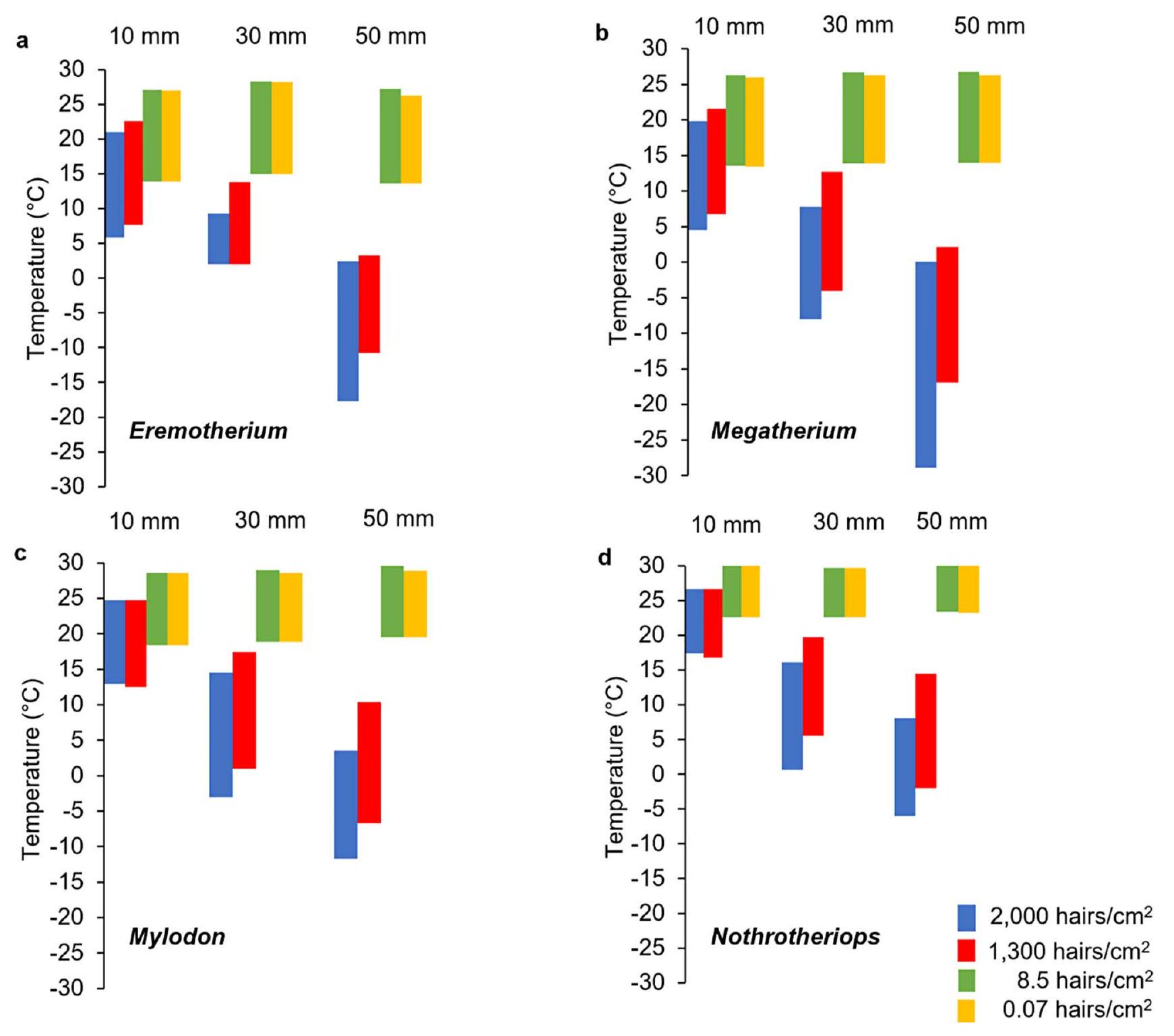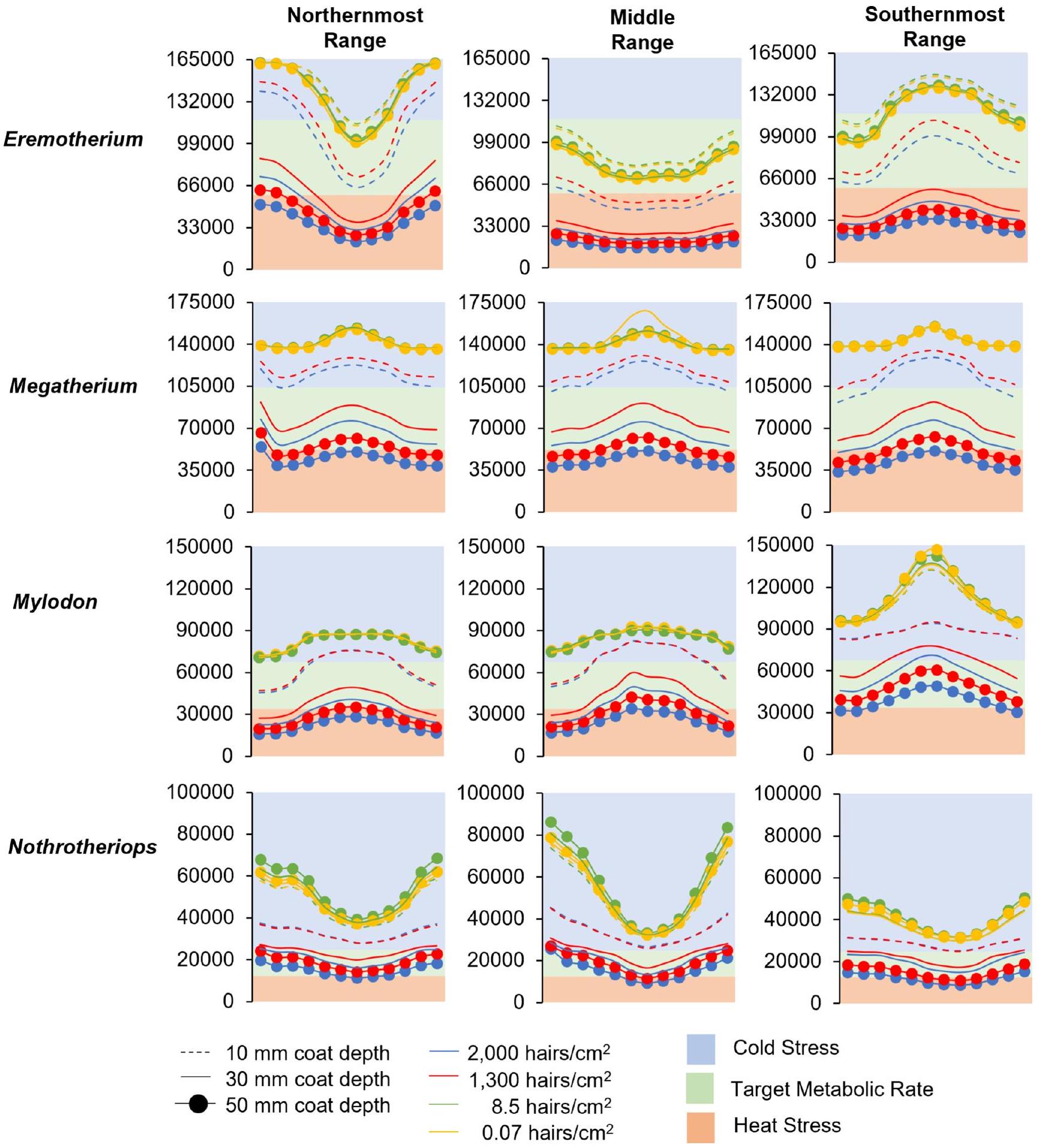 was modeled to have no thermal stress with 10 mm fur during the warmest months of the year and also with 30 mm fur during the coldest months at northern and mid latitudes (Fig. 6). Both Mylodon at the southernmost extent of its range and Nothrotheriops across its entire geographic range were determined to have no heat stress with dense fur with a coat thickness of 50 mm .