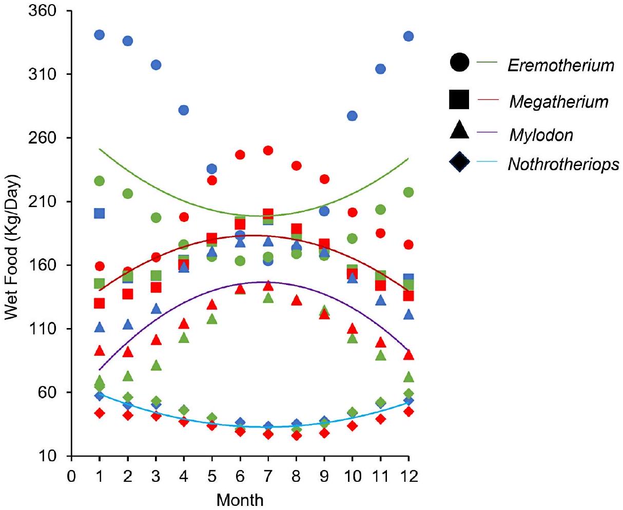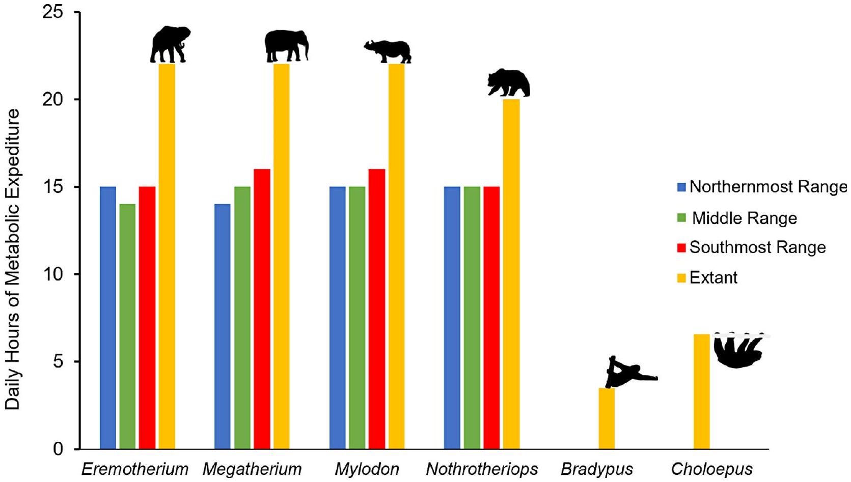 mid-latitudinal and southern geographic ranges of Megatherium), the greatest number of hours of metabolic activity expended per day (
