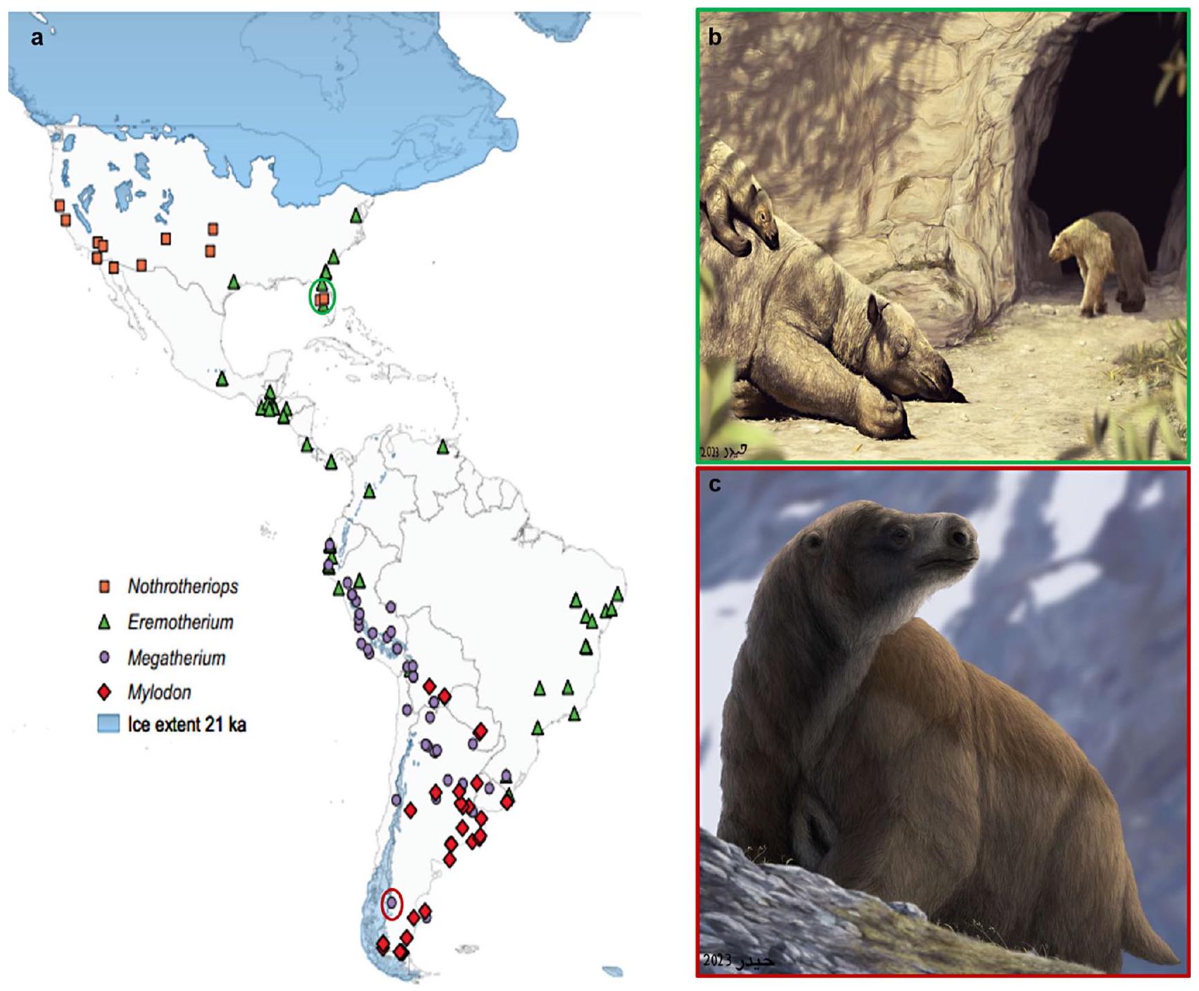 قاعدة بيانات علم الأحياء القديمة (paleobiodb.org). ب. إعادة بناء بالغ ورضيع من إيريموثيريوم أثناء تبديل الفراء الموسمي وهما يتدحرجان في بركة طينية خارج عرين كائن نوتروثيريوبس الناشئ في أوائل الربيع في فلوريدا خلال العصر الجليدي (الموقع موضح بالدائرة الخضراء في اللوحة 9a). ج. إعادة بناء ميغاثيريوم وهو يتحمل برودة ورياح بامباس الأرجنتين مع فرو سميك (الموقع موضح بالدائرة الحمراء في اللوحة 9a). فن باليو من هايدر سيد جعفري