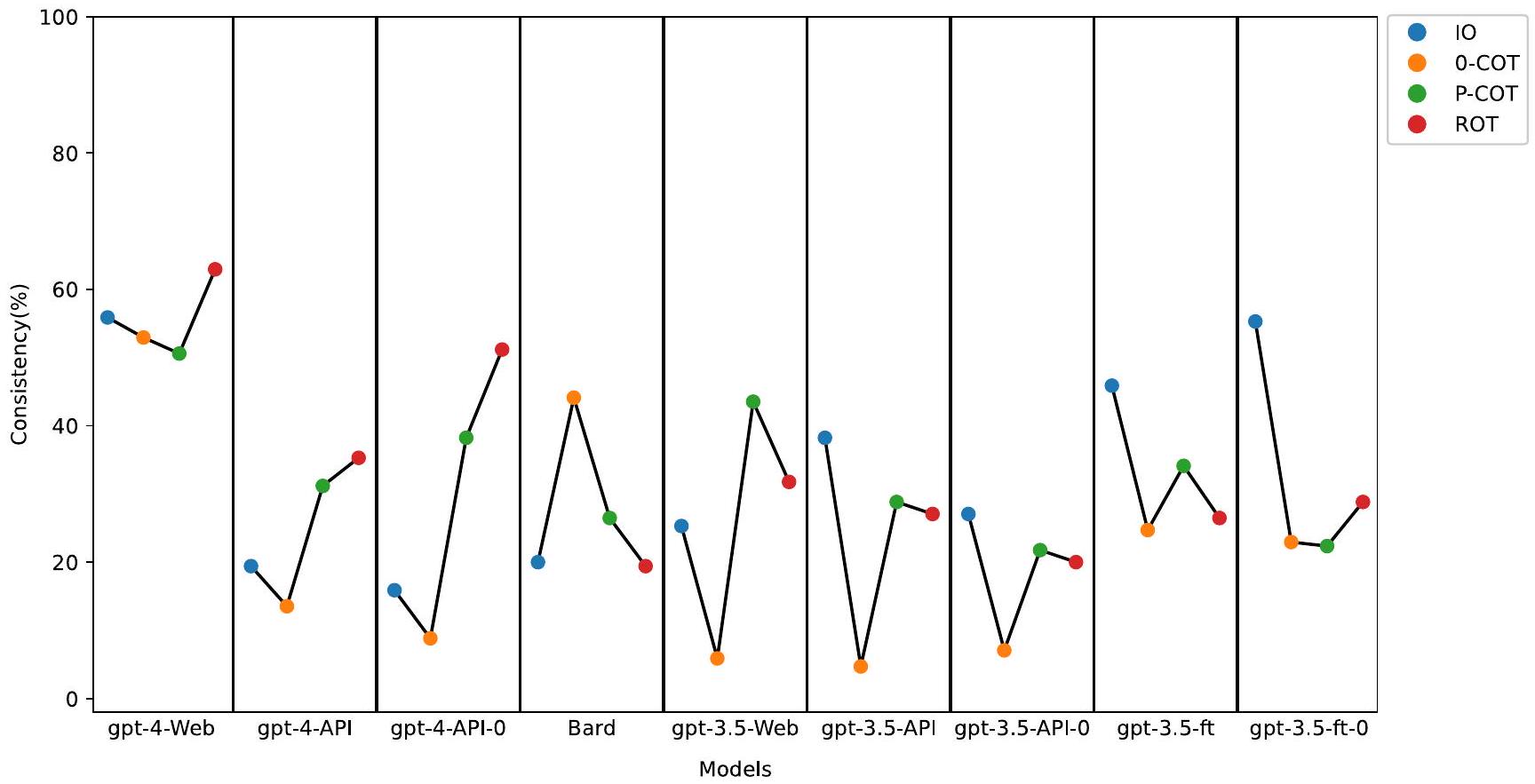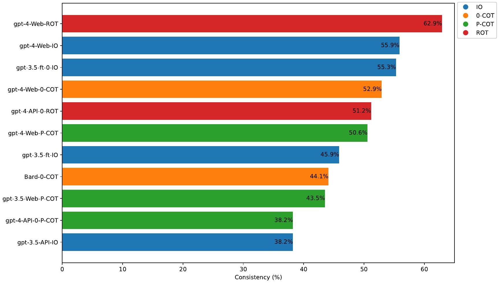 أشارت النتائج إلى أن gpt-4-Web تفوق على النماذج الأخرى، كما هو موضح في الشكل 1. كانت معدلات الاتساق للأربعة مطالب في gpt-4-Web يتراوح بين و تمت ملاحظة معدلات اتساق أخرى أيضًا مع تحفيز IO في gpt-3.5-ft-0 بنسبة 55.3% وتحفيز ROT في gpt-4-API-0 عندكانت معدلات التناسق للنماذج الأخرى جميعها أقل منإلى.