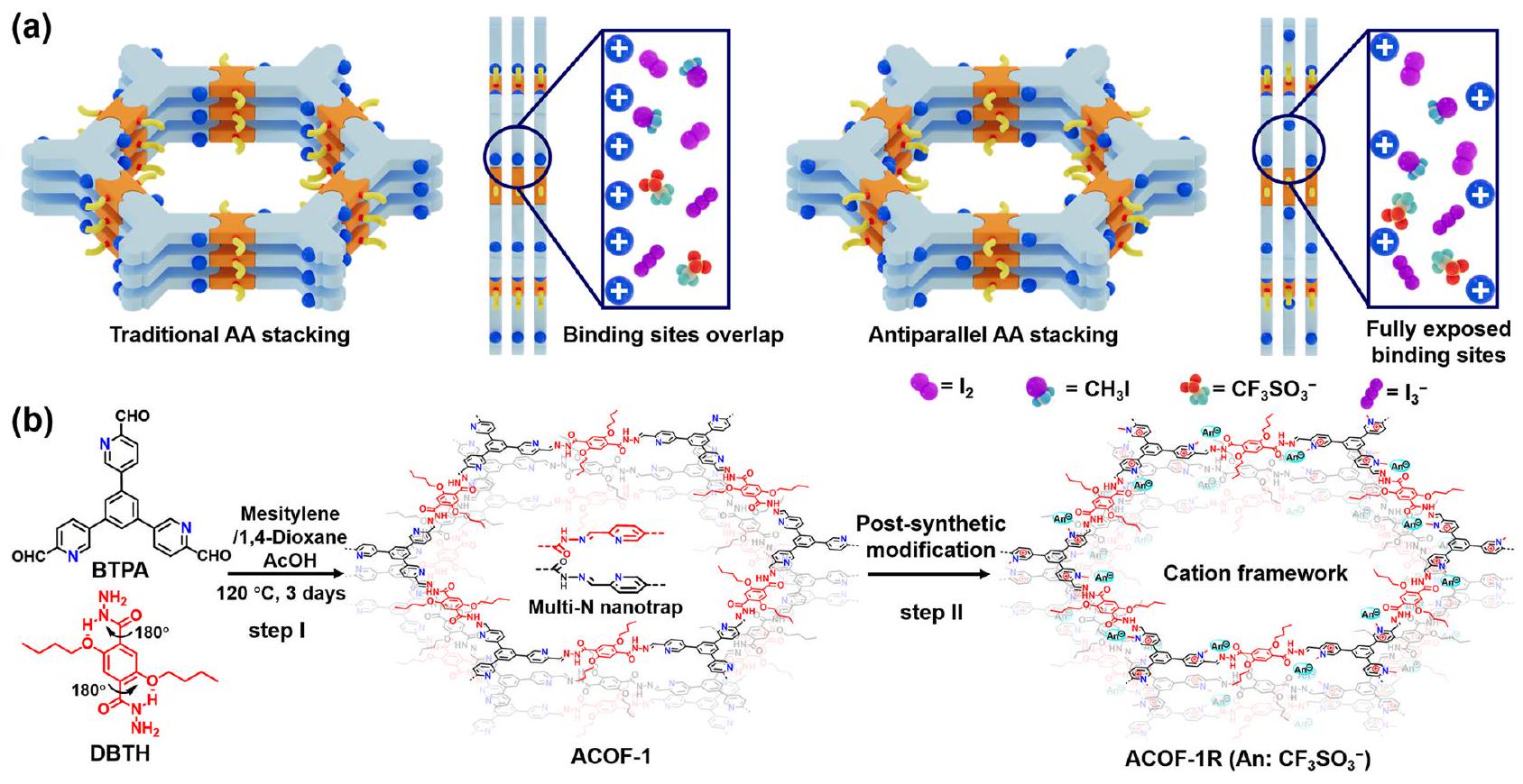 باختصار، تم تخليق وتوصيف هيكلي لمركب COF المكدس المعاكس (ACOF-1) ومشتقه الكاتيوني (ACOF-1R). وبفضل ميزاته الهيكلية الفريدة، أظهر ACOF-1 تفضيلاً ميل نحو و ، لا سيما لـ ، باستخدام وحدات بيريدين-N وهيدرازين (أي، “مواقع مصيدة متعددة-N نانوية”) التي تصطف على المسام لربط هذه الجزيئات بقوة. يمكن لـ ACOF-1 التقاط و تحت ظروف مختلفة. ومن الجدير بالذكر أن ACOF-1 أظهر ديناميكية عاليةسعة الالتقاط لـفي، متجاوزًا أداء معظم المواد الماصة الأخرى المعتمدة على COF تحت ظروف مشابهة. كما أنه يحتفظ بأداء امتصاص ممتاز في وجود بخار الماء. يمكن للإطار الكاتيوني ACOF1 R إزالة أيونات التريوديد بكفاءة من المحاليل المائية، مما يؤدي إلى أداء امتصاص مرتفع ( ) في المياه الجوفية الملوثة. كانت القدرة العالية على الامتصاص وسرعة الديناميكا الإعلانية التي أظهرتها ACOF-1 و ACOF-1R تجاه أنواع اليود المختلفة مرتبطة جوهريًا بنمط التكديس المتوازي المعاكس للـ COF. هذه الهياكل المتوازية المعاكسة AA منحت روابط قوية مع أنواع اليود المختلفة من خلال التفاعل التآزري بين الطبقات، مما أتاح أداءً ملحوظًا في الامتصاص. هذا العمل كدليل على المفهوم يوجه تطوير مواد ماصة محسنة قائمة على COF تستغل الوظائف التآزرية التنسقية لالتقاط ملوثات اليود وتطبيقات أخرى.