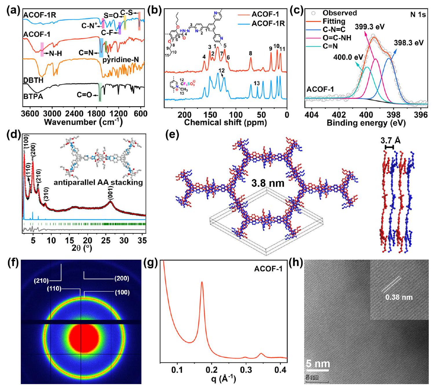 الاختلافات (رمادي). يظهر الشكل المرفق النموذج الهيكلي لـ ACOF-1 بافتراض وضع تكديس AA المعاكس. e العرض العلوي والجانبي لهيكل بلوري تكديس AA المعاكس لـ ACOF-1. f، g صورة 2D SAXS ونمط ACOF-1. h صورة HRTEM لـ ACOF-1 (الشكل المرفق: عرض موسع يظهر المسافة بين الطبقات). تقنيات. أظهر طيف الأشعة تحت الحمراء بواسطة تحويل فورييه (FT-IR) لـ ACOF1 قمة شديدة عند (الشكل 2أ). ستحتوي هذه القمة على مساهمات من (إيمين) و اهتزازات الشد في ACOF-1، مع تكوين مجموعات الإيمين من خلال تفاعلات التكثيف بين مجموعات الألدهيد والهيدرازين في BTPA و DBTH، على التوالي.تم تأكيد وجود روابط الإيمين بشكل إضافي بواسطةطيف الرنين المغناطيسي النووي (NMR) بتقنية دوران الزاوية السحرية مع الاستقطاب المتقاطع (CP-MAS) لـ ACOF-1، الذي أظهر إشارة رنين مميزة للأمين عند 150.8 جزء في المليون (شكل 2ب). إشارات إضافية عند، ويمكن أن يُعزى 12.7 جزء في المليون إلى مجموعة البوتوكسي في مكون DBTH. تم تحليل طيف التحليل الطيفي للأشعة السينية (XPS) لـ ACOF-1 إلى ثلاثة قمم عند ، و 400.0 إلكترون فولت، والتي يمكن بسهولة نسبها إلى (أي، نيتروجين بيريديني) ، و على التوالي. أشارت البيانات إلى النجاح في بناء COF بالهيكل المطلوب (الشكل 2c، الشكل التوضيحي 1).