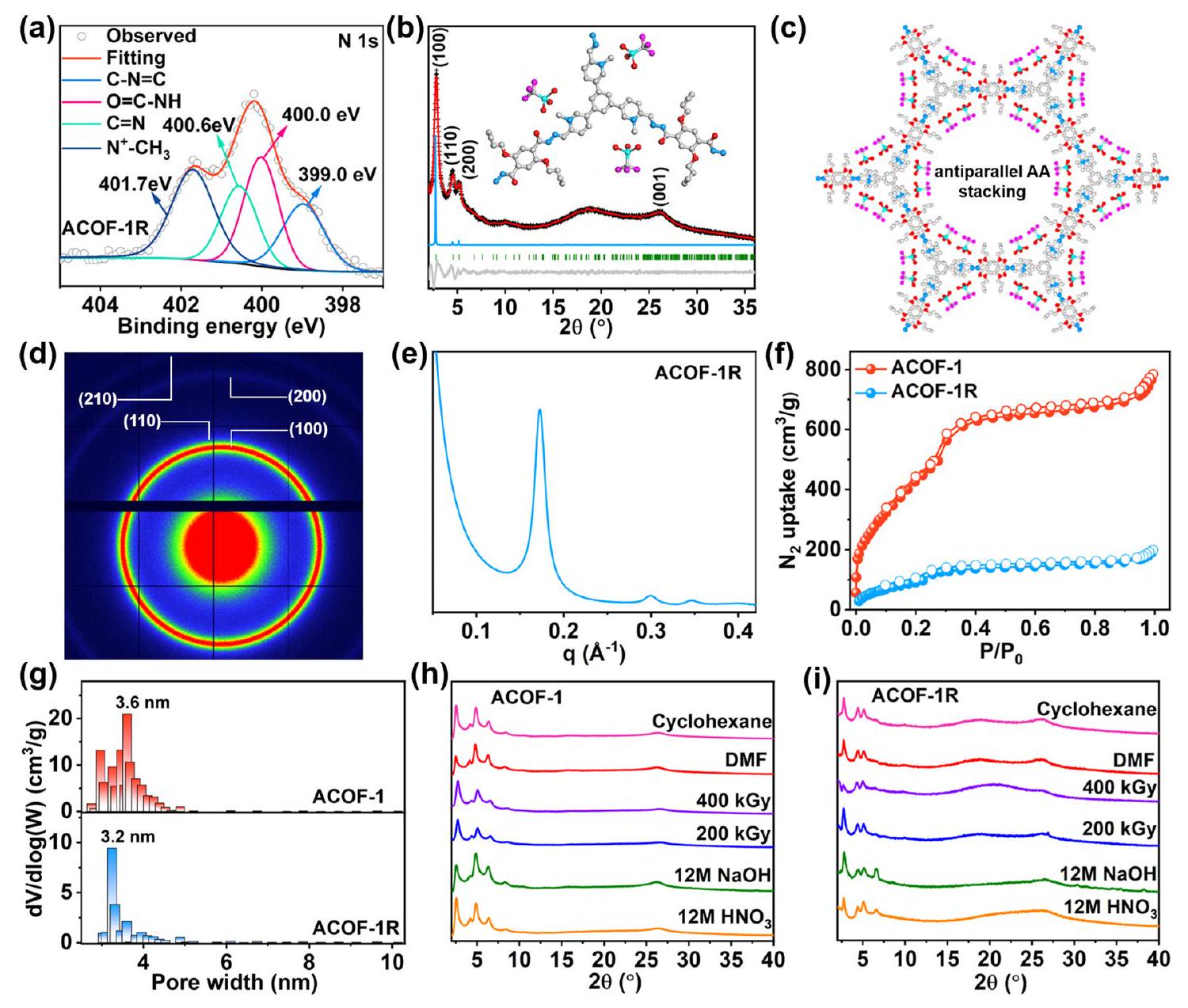 the first stage of spent fuel reprocessing (i.e. from spent fuel dissolved in nitric acid solutions), as well as capture from wastewater containing radioactive iodine ions. To achieve this ambitious task, we herein selected a COF supporting electron-rich pyridine-N linkers and nearby hydrazine sites, possessing an antiparallel stacking -electron conjugated framework (denoted as ACOF-1), as a proof-of-concept adsorbent for iodine species (Fig. 1a). The pyridine-N groups efficiently bind and molecules, with the binding affinity being improved by nearby hydrazine sites. Moreover, the antiparallel stacked layers in ACOF-1 form three-dimensional “multi-N nanotrap sites”, significantly enhancing the utilization and affinity of chelating sites. Subsequently, post-synthetic methylation of the pyridine-N sites created cationic pyridinium-N units, with the obtained COF (denoted as ACOF-1R) offering a high density of accessible exchange sites. Through detailed experimental studies, ACOF-1 was shown to offer an exceptional affinity toward under various conditions, achieving a high dynamic uptake performance of at , making it one of the best extractants reported to date. In addition, a packed column containing cationic ACOF-1R showed exceptional adsorption properties toward aqueous (with a high uptake capacity of ), rapidly decontaminating polluted groundwater to drinking water level. The excellent performance of the developed ACOF-1 and ACOF1 R , together with their applicability in diverse settings, confirm their promise as adsorbents for iodine pollutants under practical conditions, such as from nuclear waste and contaminated water.