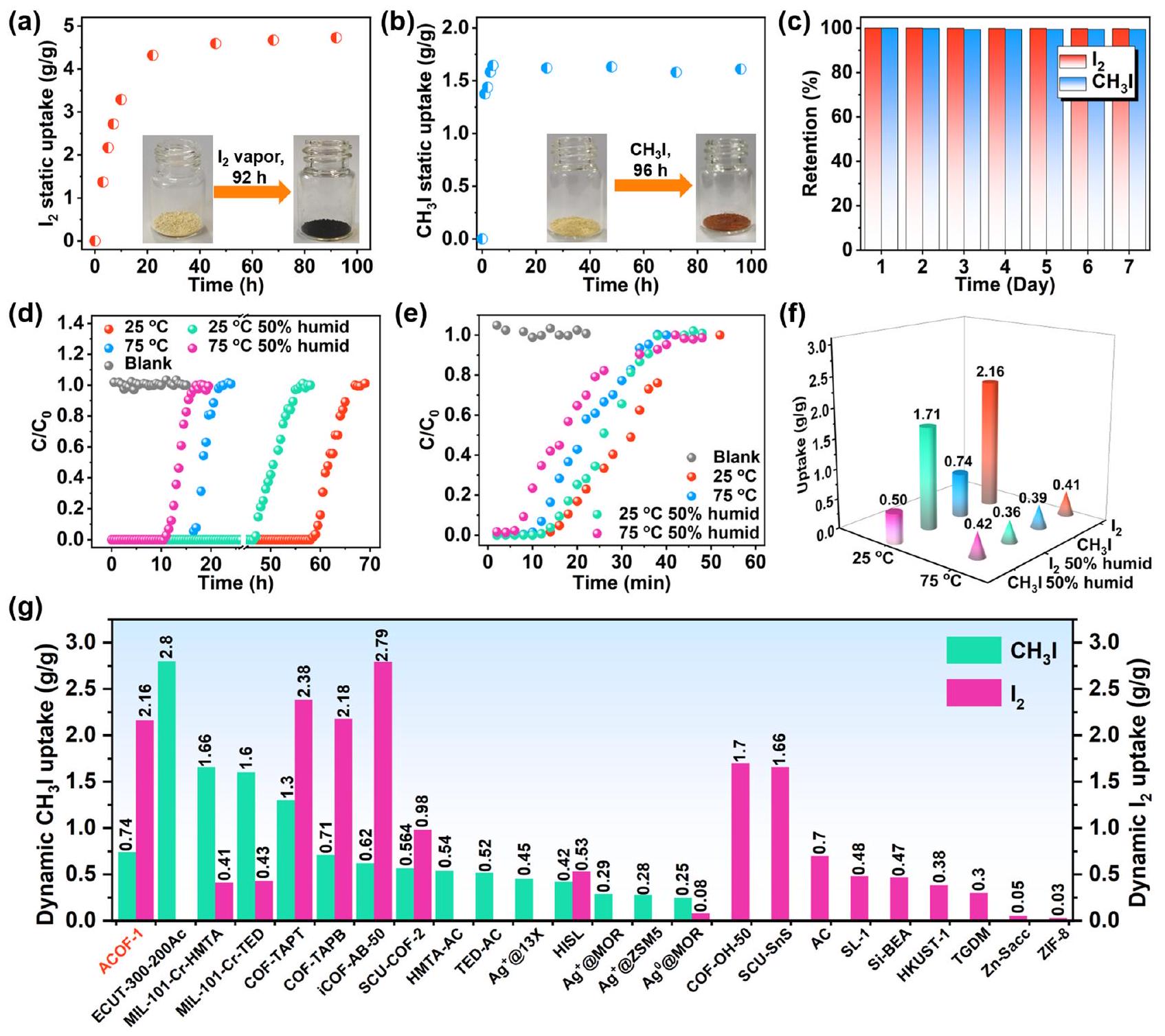 vapor. ACOF-1 displayed very fast adsorption kinetics, with an uptake value reaching of equilibrium capacity within 92 h (Fig. 4a). Subsequently, we carried out adsorption studies. As expected, very fast uptake kinetics and a high capacity of of ACOF-1 were observed under (Fig. 4b). These values are comparable to those of state-of-the-art sorbents under the same adsorption conditions, such as COF-TAPT and SCU-COF-2 (Supplementary Tables 5, 6). Exposure of the – and I-saturated COF (i.e., ACOF-1) to air at for 7 days resulted in negligible weight loss, suggesting a strong host-guest interaction between (or ) and ACOF-1 (Fig. 4c). Results indicate that ACOF-1 has great potential for the capture of and at low concentrations in gas streams. The fast kinetics and high and uptake performance of ACOF-1 prompted us to evaluate its dynamic adsorption ability, which was explored through fixed bed column breakthrough tests performed under various conditions. Breakthrough experiments for dynamic and capture under different conditions used ACOF-1 filled quartz columns (Supplementary Fig. 14). ACOF-1 exhibited fast uptake kinetics, reaching adsorption breakthrough-equilibrium within 67 h and 22 h at and , respectively, with the equilibrium dynamic capacities being and , respectively (Fig. ). To explore the effect of humidity on uptake, we next examined the dynamic adsorption performance of ACOF-1 using breakthrough experiments conducted at 50% relative humidity. Impressively, ACOF-1 effectively captured under humidity conditions, reaching equilibrium after and at and , respectively. The slightly lower uptake capacities of ACOF-1 at relative humidity may have been due to some adsorption of molecules at “multi-N nanotrap sites” during the dynamic breakthrough tests.