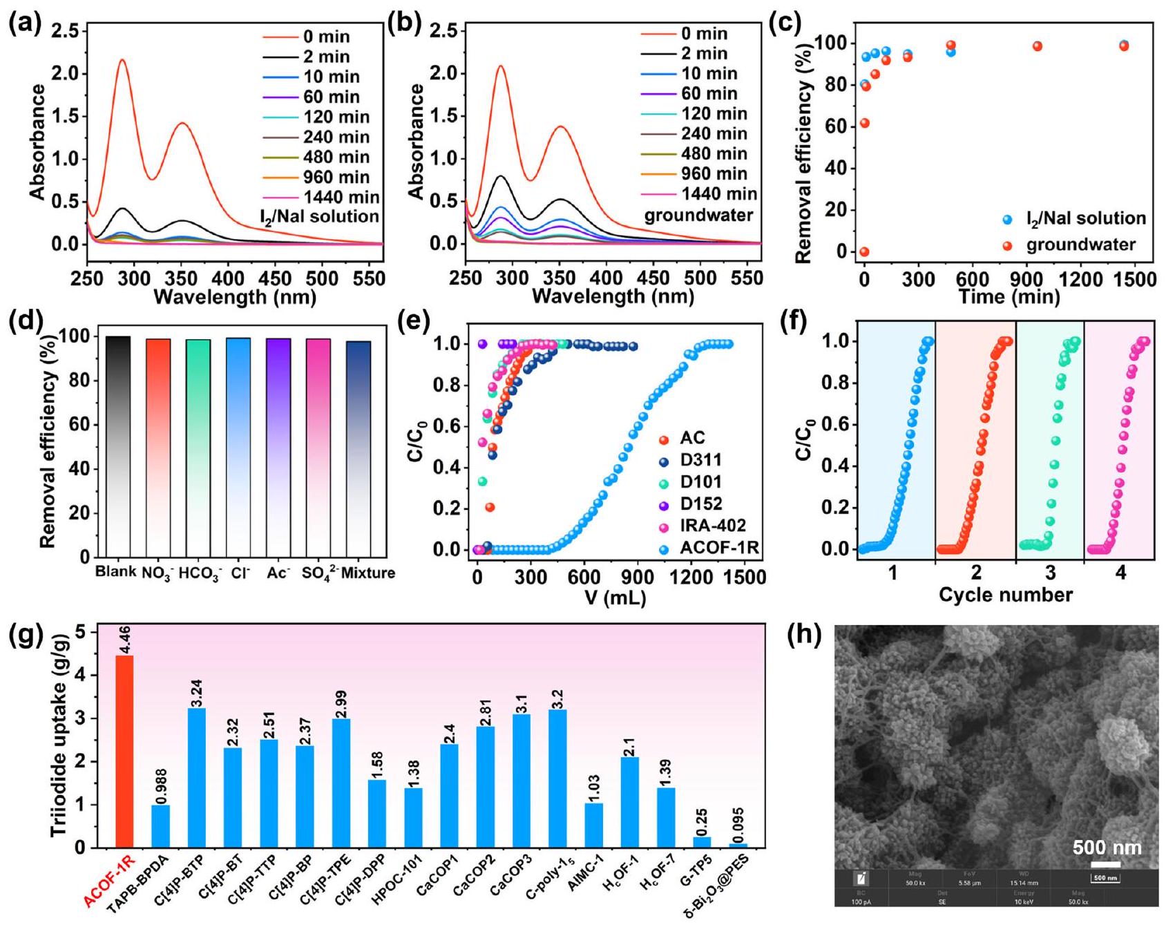 نظرًا للحركية البيئية العالية لـيمكن أن تنتقل الملوثات القائمة على اليود بسرعة إلى المياه الجوفية، حيث تشكل تهديدًا خطيرًا للحياة المائية والبشر. مشجعين بالنتائج المذكورة أعلاه، افترضنا أن ACOF-1R الذي يحتوي على البيريدين-ستوفر مواقع الربط مواقع ربط وفيرة لـالأنيونات. تم إجراء قياسات الامتصاص على ACOF-1R في حلول ( ) تحت ظروف مختلفة. تم إجراء تجارب الامتصاص الأولية لتقييم حركية العمل لـ ACOF-1R عند نسبة الممتز إلى السائل من في محاليل اليود المائية (الشكل التكميلي 17).