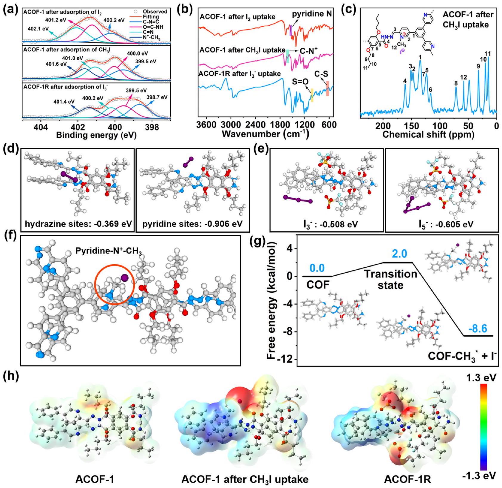 to explore iodine species captured by ACOF-1 and ACOF-1R. On the basis of the above FT-IR and XPS results, we first considered binding on the N-containing hydrazine and pyridine sites of ACOF-1. The structural models of hydrazine (or pyridine) sites were chosen to represent the 2D layered structure of antiparallel AA stacking ACOF-1 (Fig. 6d). The binding free energies of hydrazine sites and pyridine sites were calculated to be -0.369 eV and -0.906 eV , respectively (Fig. 6d). The higher binding free energy of /pyridine suggests a stronger binding affinity compared to hydrazine, thus will adsorb closer to the pyridine sites than the nearby hydrazine sites. Furthermore, the calculated binding energies of /”multi-N nanotrap” sites and “multi-N nanotrap” sites were -0.508 eV and -0.605 eV , respectively, suggesting very strong binding affinities of “multi-N nanotraps” for iodine anions (Fig. 6e). The aforementioned solid-state NMR studies revealed that adsorbed on the pyridine- N sites in ACOF-1. We thus calculated the relative free energy diagrams for adsorption. As shown in Fig. 6f, adsorbed molecularly on pyridine-N sites forming a transition state with an increase in free energy ( ), followed by a free energy decrease to mol with the release of , accounting for the superior adsorption performance of ACOF-1 for under various conditions. Electrostatic potential (ESP) distribution analysis showed the local