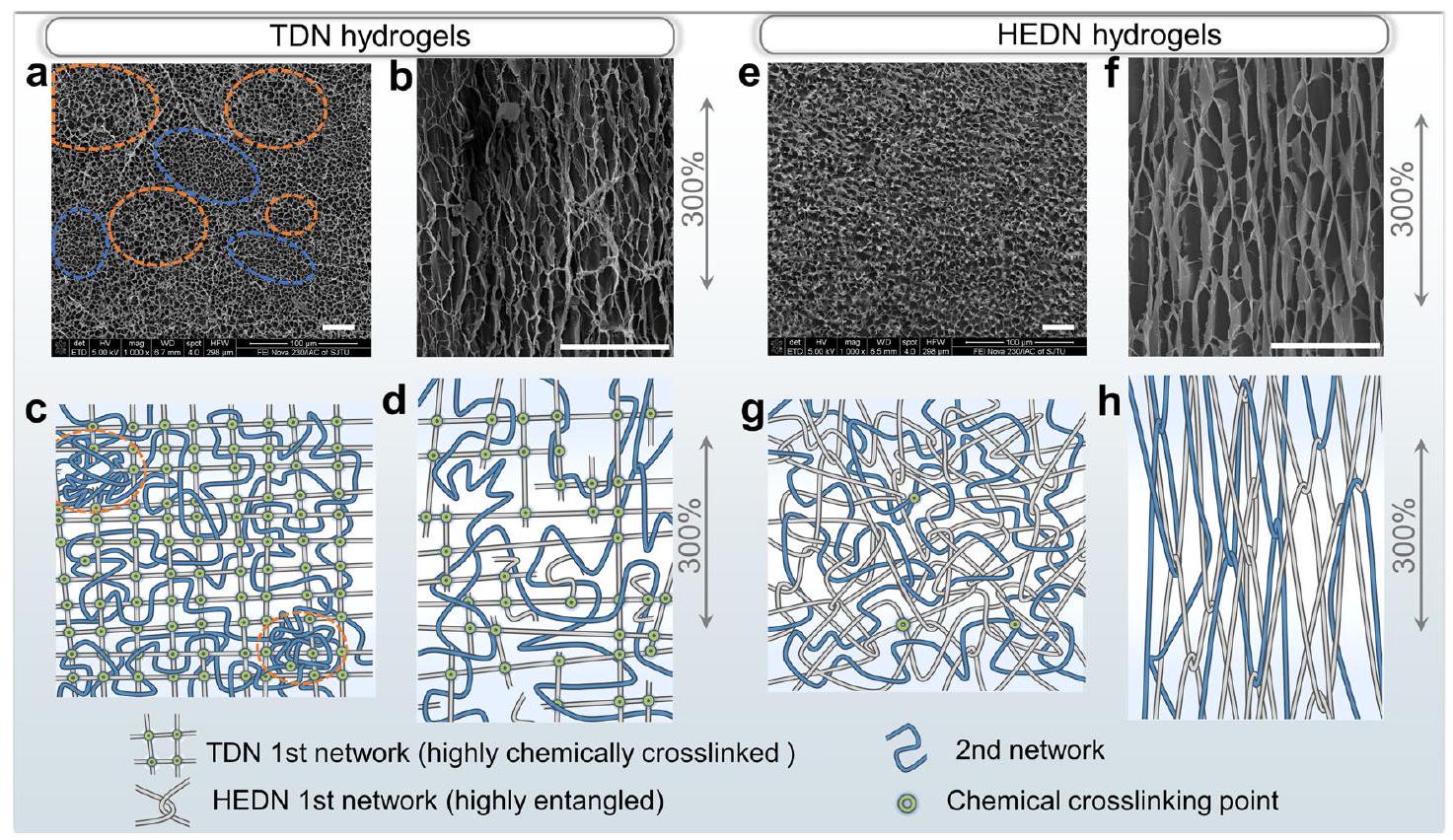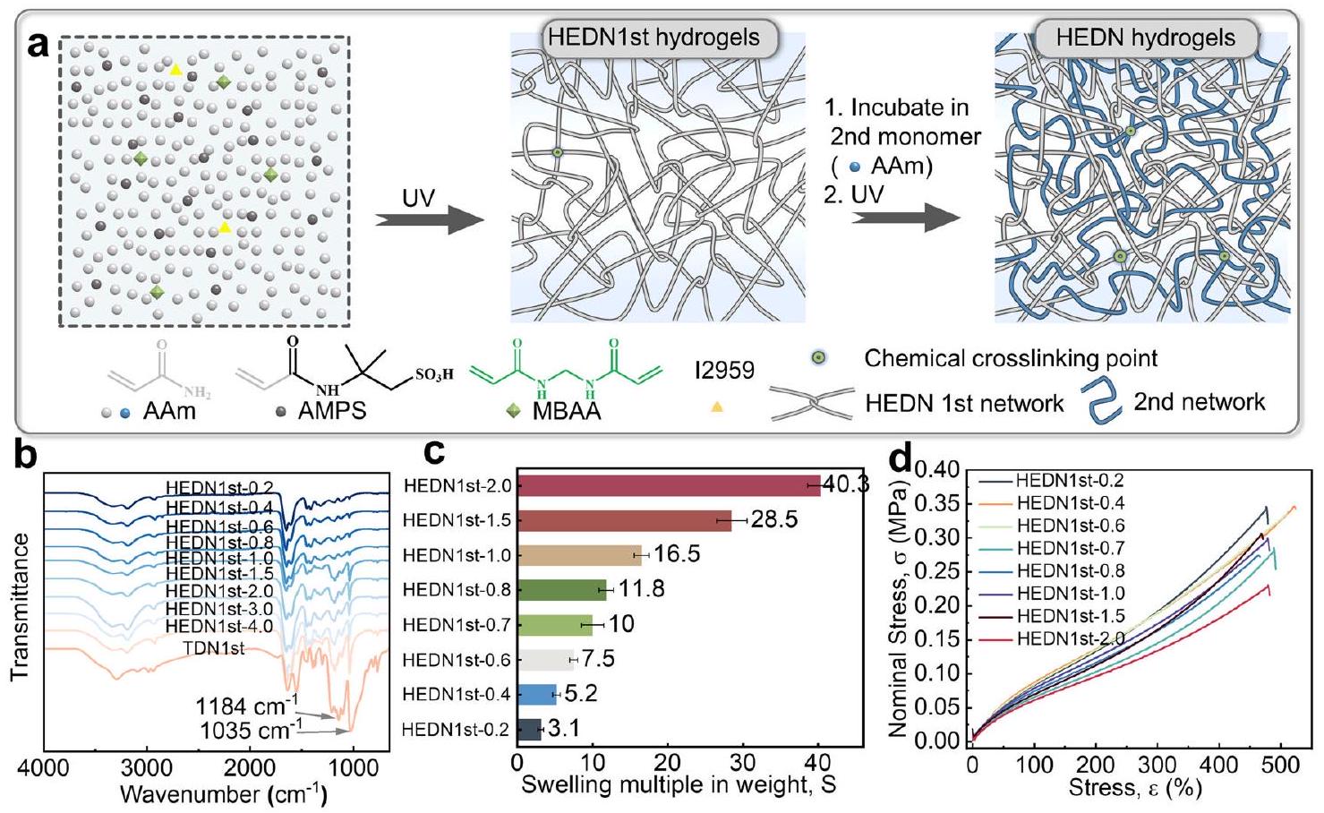 إلى الطبيعة الضعيفة للإلكتروليت لـ AAc. تضاعف انتفاخ هيدروجيل HEDN1st زاد تدريجياً مع زيادة محتوى AMPS، وكان تضاعف انتفاخ هيدروجيل HEDN1st-4.0 مرتفعاً جداً حيث بلغ 19 بسبب التنافر الكهروستاتيكي القوي بين سلاسل البوليمر الكهربي ذات الكثافة العالية. لا تزال هيدروجيل HEDN-AAc التي تم تحضيرها باستخدام AAc كأحادي الشبكة الثاني تتمتع بخصائص ميكانيكية جيدة. تُظهر الشكل 6b أن قوة الشد لهيدروجيل HEDN-AAc تزداد أولاً ثم تنخفض مع تضاعف الانتفاخ، حيث يتمتع هيدروجيل HEDN-AAc-3.0 بأعلى قوة شد تبلغ 2.1 ميجا باسكال، ويصبح ظاهرة تصلب الشد واضحة تدريجياً. كما أظهرت قوة الضغط لهيدروجيل HEDN-AAc اتجاهًا مشابهًا، حيث أظهر هيدروجيل HEDN-AAc-3.0 قوة ضغط تبلغ 45 ميجا باسكال. تُظهر الشكل 6d أن هيدروجيل HEDN-AAc-3.0