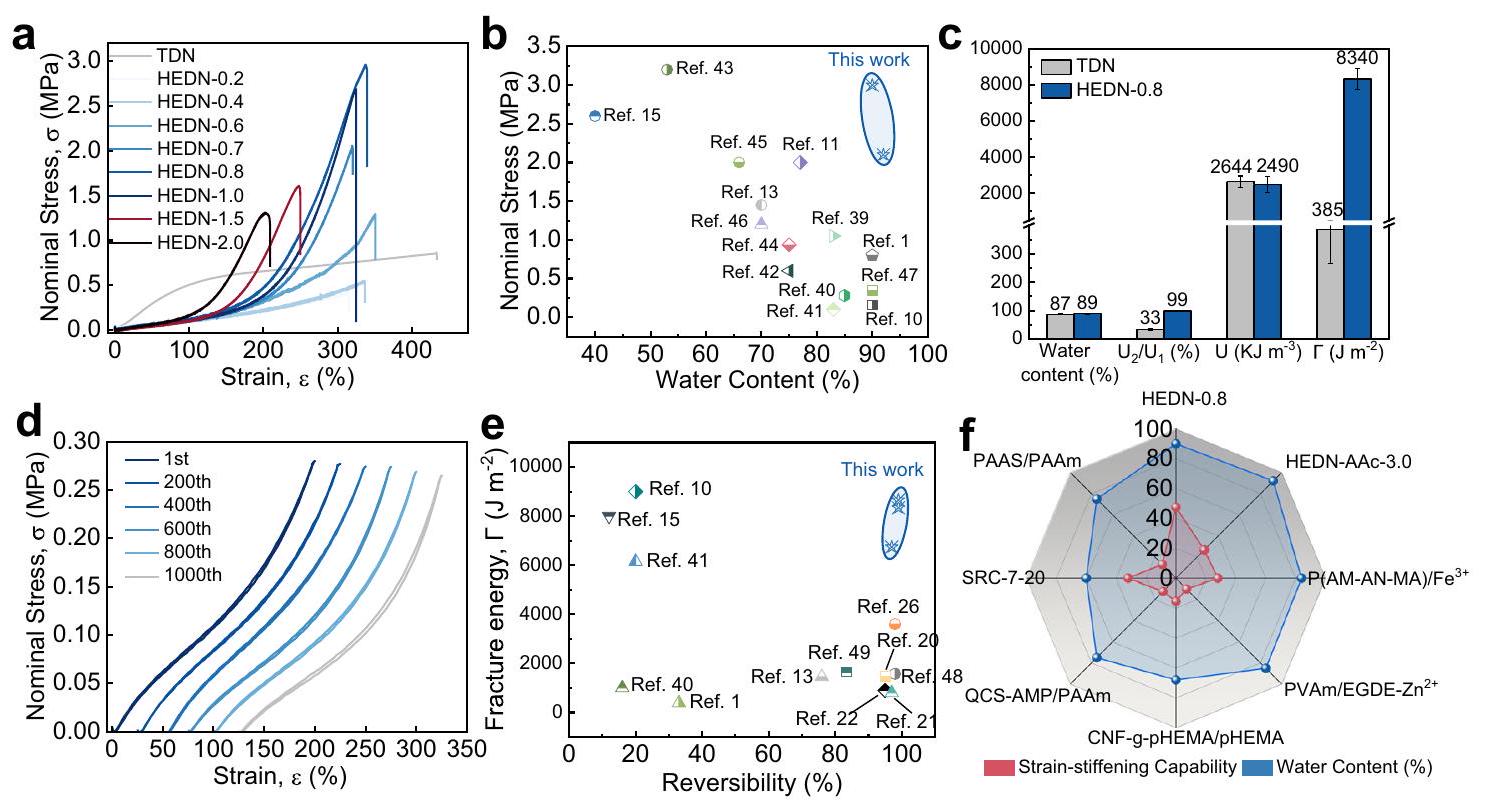 نقاط التشابك تعمل على توحيد سلاسل البوليمر ذات الأطوال المخفية المختلفة، أي أن جميع سلاسل البوليمر مشدودة بشكل متساوٍ. تظهر هلاميات HEDN تقريبًا عدم وجود كسر في سلاسل البوليمر خلال الشد الأولي، ويحدث فقط توجيه لسلاسل البوليمر. في هذه العملية، يتم تخزين الطاقة على شكل فقدان في الإنتروبيا. عندما يتم إزالة القوة الخارجية، سيتم إطلاق هذه الطاقة على شكل زيادة في الإنتروبيا. عندما يتم شد هلاميات HEDN إلى حد معين، تصبح سلاسل البوليمر موجهة بشكل كبير، ويصبح المادة صلبة جدًا في اتجاه القوة المطبقة، مما يظهر سلوكًا نموذجيًا لزيادة الشد. كما هو موضح في الشكل التكميلي 12b، يستمر معامل هلاميات HEDN في الزيادة مع الشد. تتجاوز قدرة زيادة الشد لـ HEDN-0.8 و HEDN-1.0 الـ 40 (الشكل التكميلي 13)، مما يظهر سلوكًا قويًا من التعزيز الذاتي، وهو ما يساعد في تجنب تلف المادة تحت الشد الكبير.