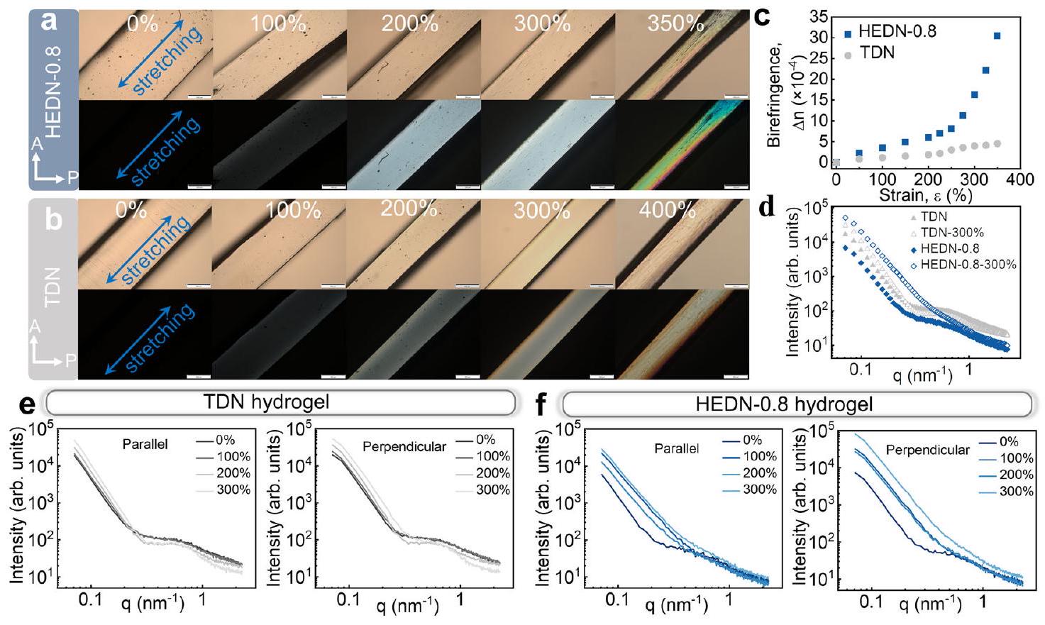 method. The shoulder on the scattering profile of the TDN hydrogel shifts slightly with increasing strain. The shoulder on the parallel profile shifts to the low-q region, while the shoulder on the perpendicular profile shifts to the high-q region. Due to the elongation of the hydrogel samples in the parallel to stretching directions, resulting in an increase in the spacing of the microdomains. In the perpendicular direction, the hydrogels become thinner, causing the microdomains to becomes closer to each other. In contrast, the scattering of HEDN-0.8 hydrogel becomes weaker with increasing strain in both parallel and perpendicular directions, indicating that stretching leads to the gradual disappearance of microdomains due to the sliding effect of polymer chain entanglements. SAXS profiles and patterns also indicate that HEDN hydrogels have high recoverability (Supplementary Fig. 21). The SAXS profiles before and after stretching show almost exactly overlapping curves, indicating that the HEDN hydrogels evolved from a non-uniform initial state to a uniform network structure after stretching, and then returned to a non-uniform structure after unloading. This recovery from a highly ordered stretch structure to a disordered entanglement structure is driven by entropy. Moreover, there is almost no energy dissipation structure in the network. Thus, HEDN hydrogels have high recoverability.
