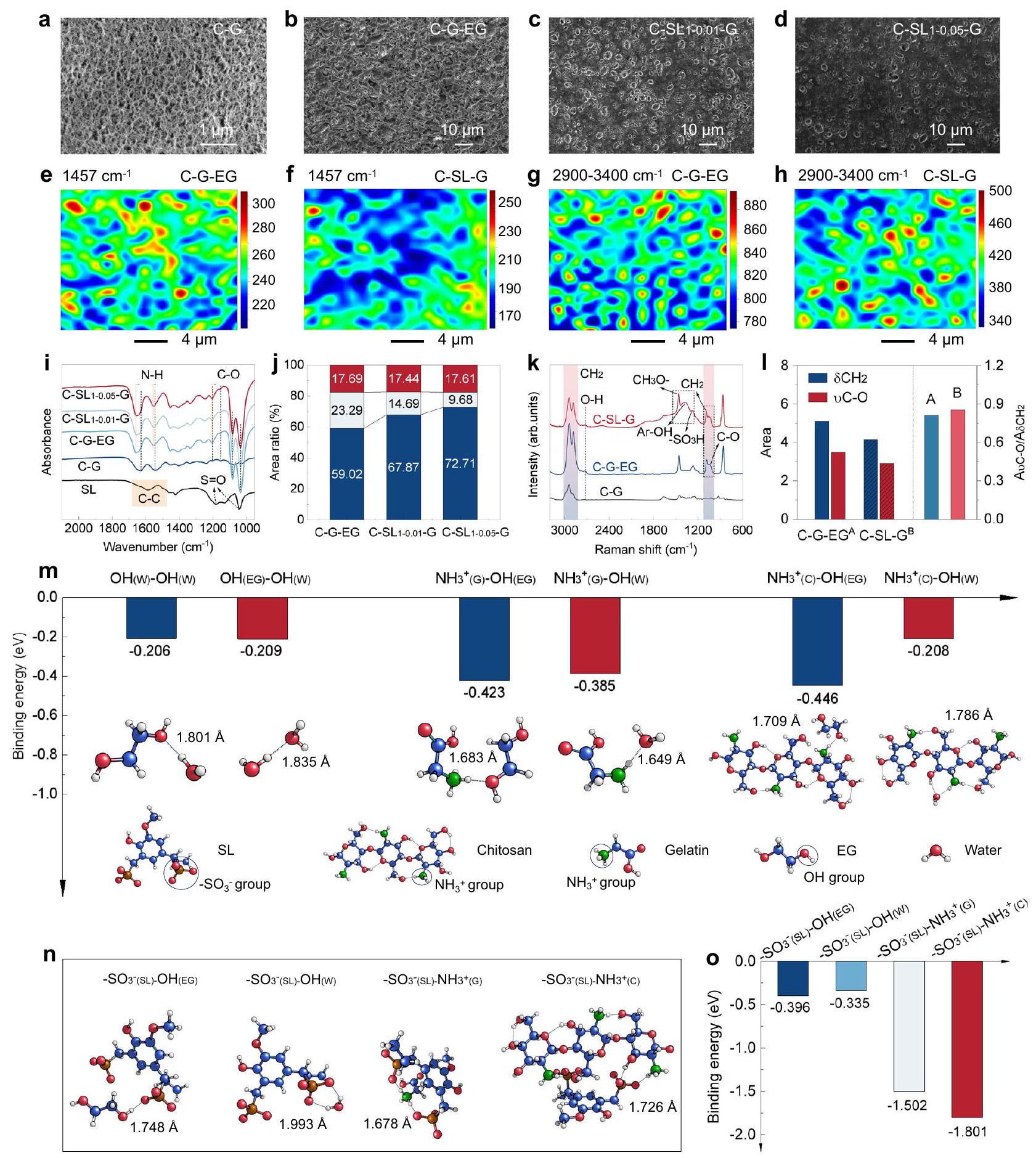 isolated EG in three groups of organohydrogels. Raman analysis of C-G, C-G-EG, and C-SL-G organohydrogels. 1 Area and proportion of C-O band symmetric stretching vibration and band rocking ( ). Calculation of binding energy and energy-optimized geometries of noncovalent bonding between OH (EG), OH (water), (chitosan), (gelatin) by DFT. n Energy-optimized geometries of noncovalent bonding between and (water), (chitosan), (gelatin), respectively, obtained by theoretical calculations from DFT studies. o Calculation of binding energy between (SL) and OH (EG), OH (water), (chitosan), (gelatin), respectively by DFT.