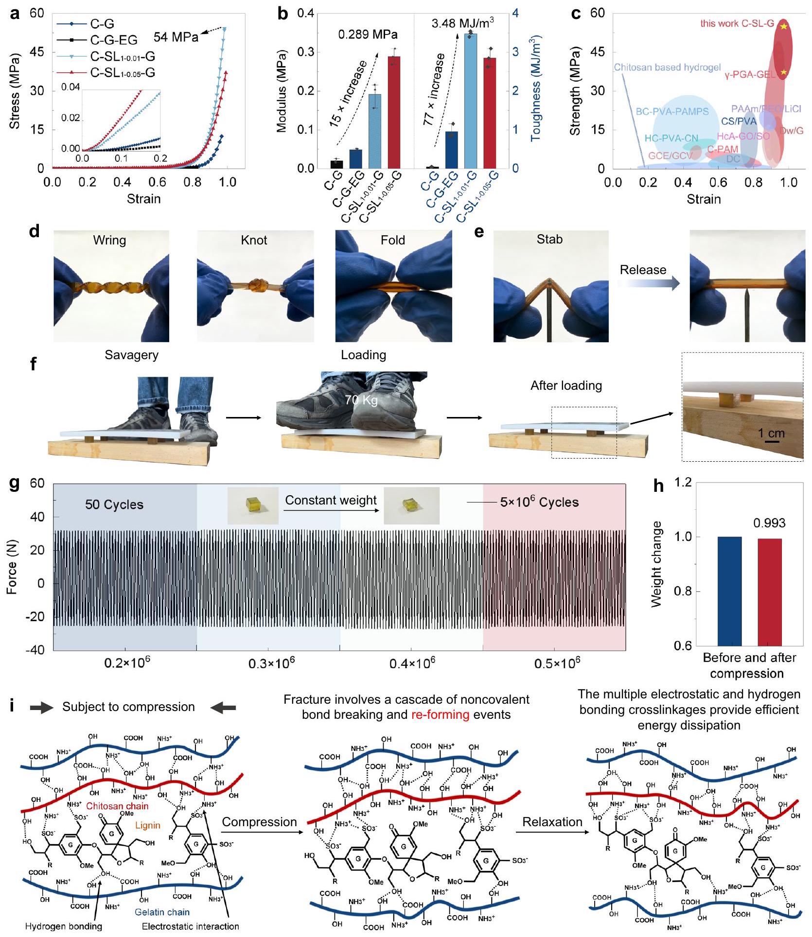 forces across the network, inducing the formation of a uniform and robust polymer network . The resulting C-SL-G organohydrogel can be compressed up to 0.9 without rupture, and maintain the original shape even after undergoing repeated 500,000 cycles at strain of 0.5 (Fig. 1b, c). Notably, the resultant tough organohydrogels display noticeable resistance to icing and offer moisturizing properties, attributed to the non-volatile nature of EG. Moreover, the C-SL-G organohydrogel with all natural components facilitates scalability through a straightforward and green “soaking” method, enabling the material and process with good sustainability, recyclability, and cost effectiveness for commercialization and large-scale application (Fig. 1c, d and Supplementary Tables 1-5). The commendable biocompatibility and biodegradability of chitosan, gelatin, and lignin, coupled with the excellent mechanical strength, fatigue resistance, and extreme environmental adaptability, open up an avenue for the advancement of robust interconnected biomedical hydrogels. Furthermore, this strategy has the potential for extension to other solvents such as lignin-glycerol solution and metal ion-EG/glycerol solution to prepare resilient multifunctional organohydrogels suitable for various applications.