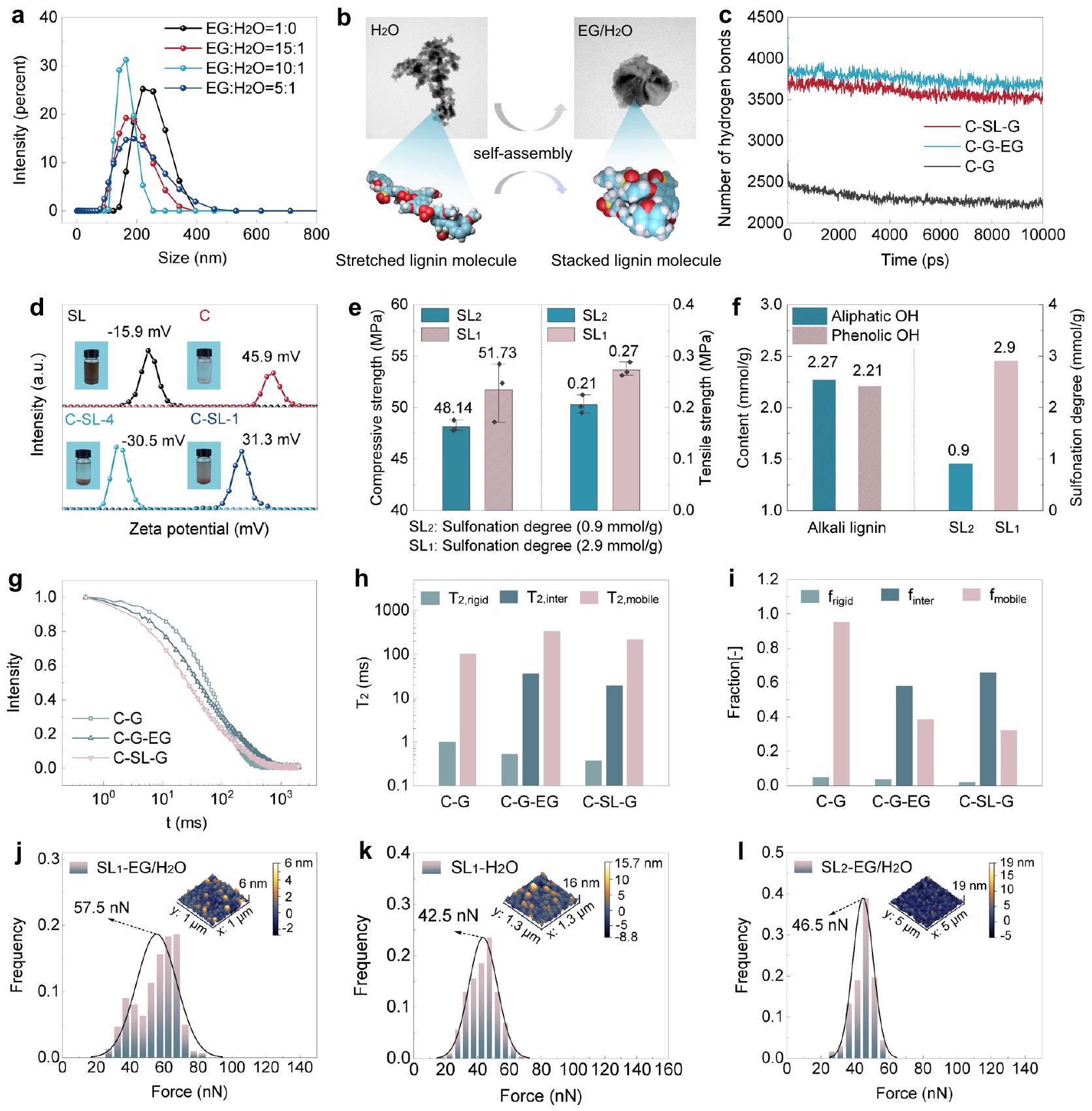 their means SDs from independent samples. Compressive and tensile strengths of two SL-based organohydrogels. g-i Low-field NMR spectroscopy. Fully refocused NMR FID (g) of C-G hydrogel, C-G-EG and C-SL-G organohydrogels. Fitting results of the fully refocused NMR FID: and of the three gels. j-I Intermolecular interaction forces between lignin and chitosan in and EG. The insets are scanned topographic maps of lignin particles under different solvents.