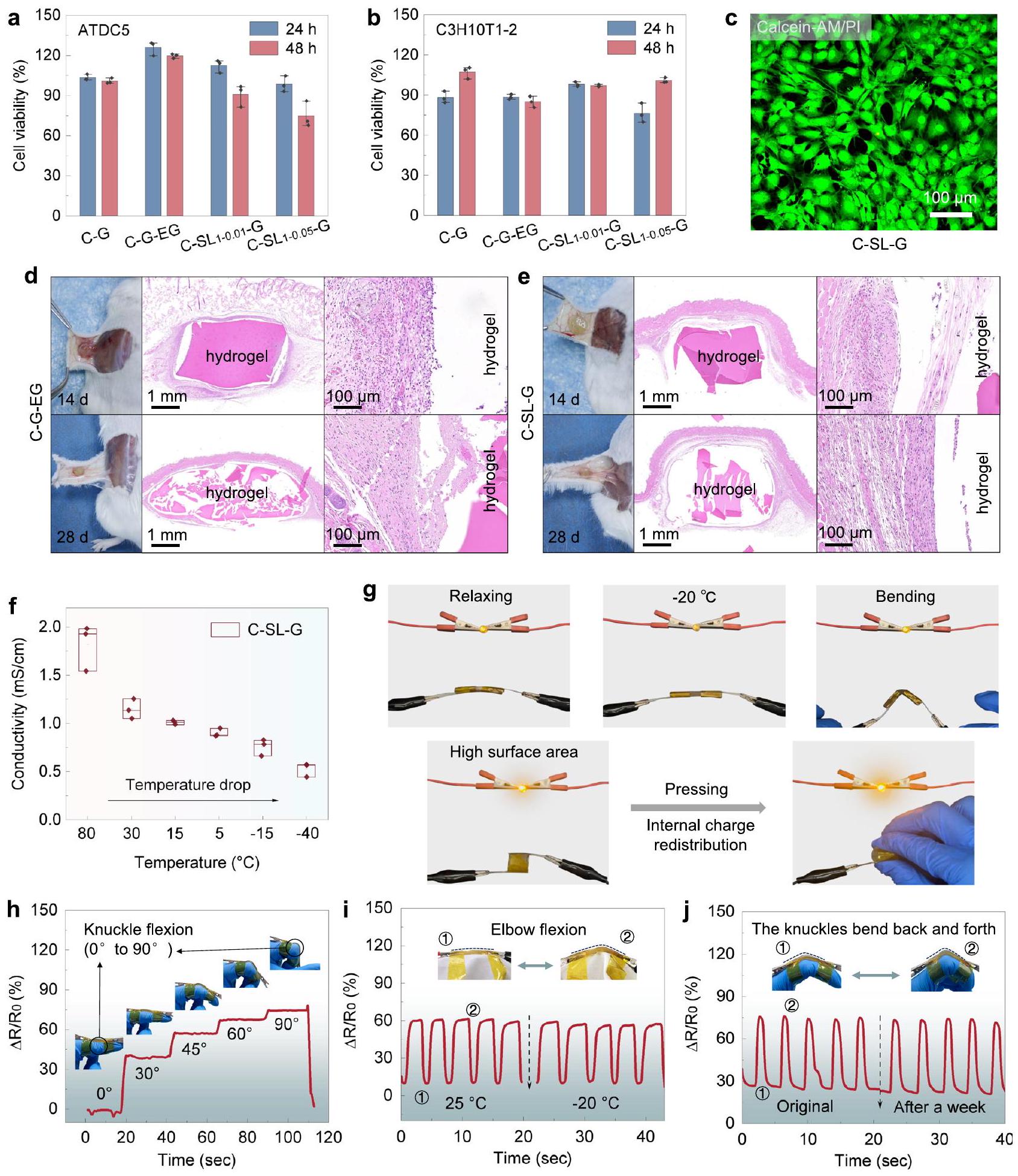 Fig. 5 | Versatility of the C-SL-G organohydrogels. Cell viability of ATDC5 cells (a) and C3H1OT1-2 cells (b) cultured on the C-G hydrogel, C-G-EG, and C-SL-G organohydrogels for 24 and 48 h . Data in and represent their means SDs from independent samples. c Confocal fluorescence microscopy images of NIH3T3 cells cultured on -G organohydrogel immersion solution for 48 h . Scale bar, . Grafting and staining images of C-G-EG (d) and C-SL -G organohydrogel (e) subcutaneously implanted in mice for 14 and 28 days after implantation. Inflammatory response to the implants was assessed by HE staining. f lonic