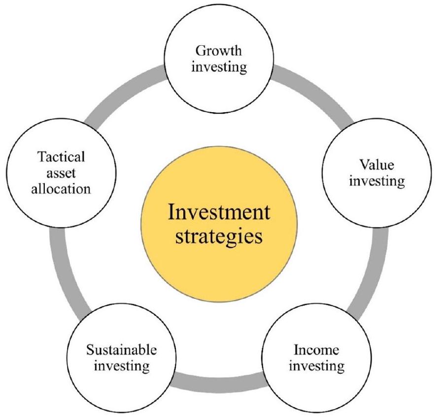 Figure 3. Various investment strategies including growth investing, value investing, income investing, index investing, sustainable investing, and tactical asset allocation.