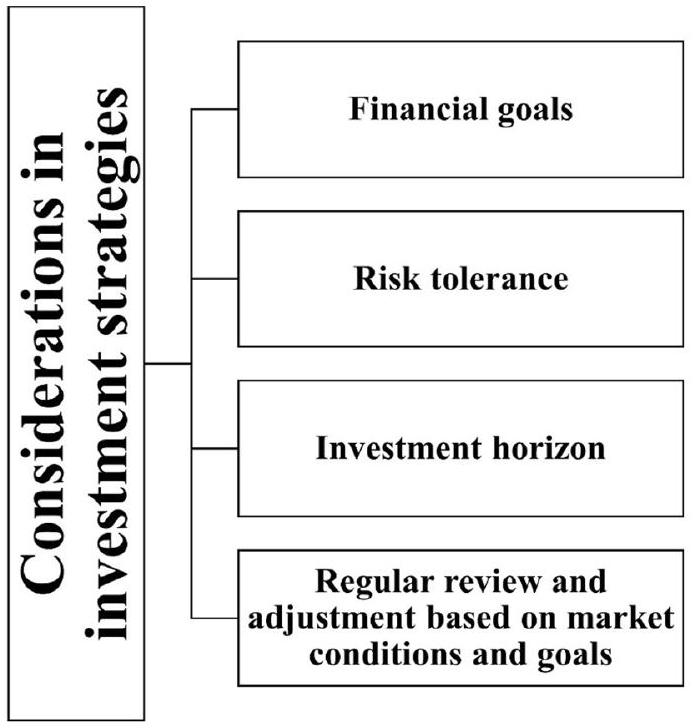 Figure 4. Considerations in investment strategies, financial goals, risk tolerance, investment horizon, and regular review and adjustment based on market conditions and goals.