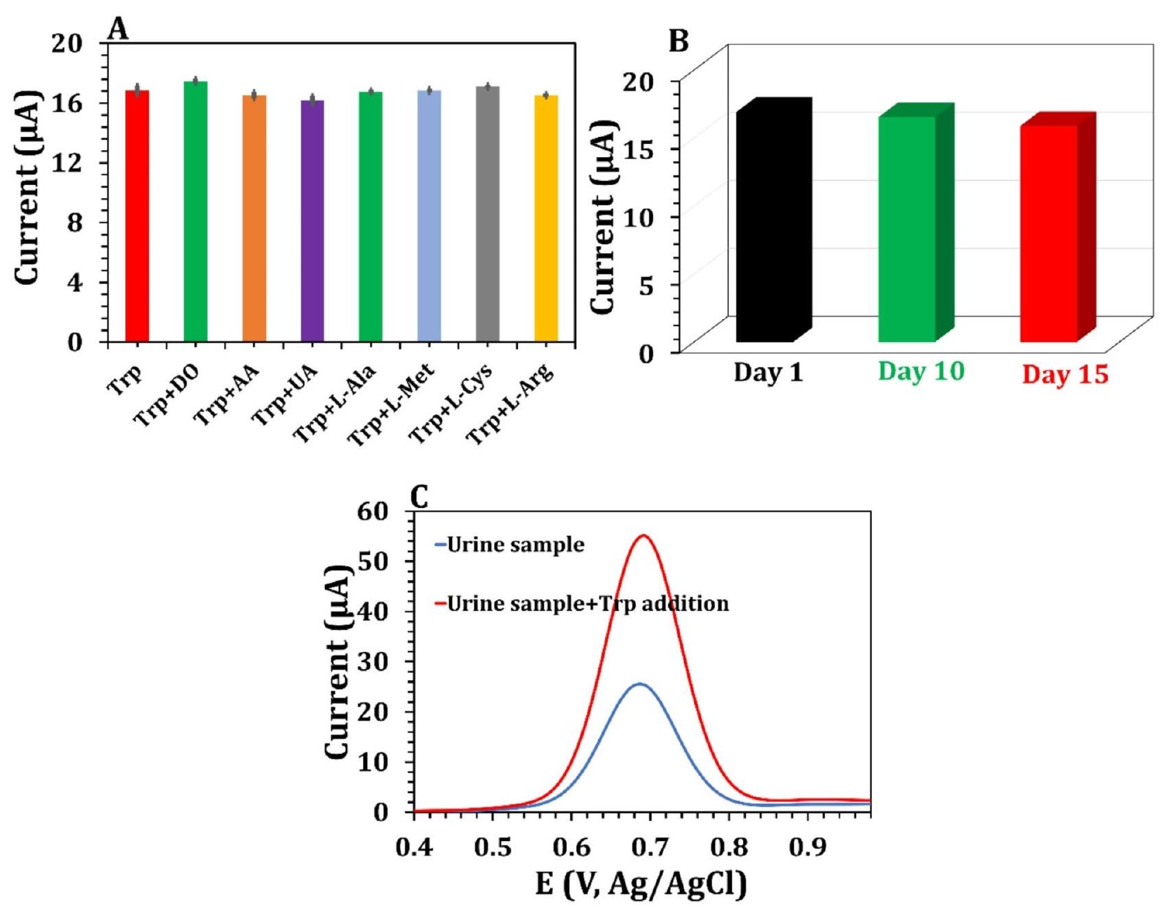 was used to record the current response via DPV. Figure 5D shows the gradual increase in the maximum current as the concentration of Trp increased within the range of