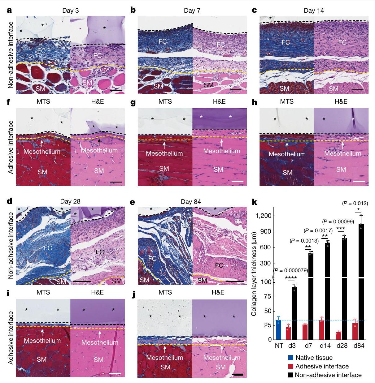 لتقييم رد الفعل تجاه الجسم الغريب وتكوين الكبسولة الليفية مع مرور الوقت، قمنا بإجراء تحليلات نسيجية للزرعات اللاصقة وغير اللاصقة على جدار البطن في الأياموسماكة طبقة الكولاجين عند واجهة الزرع والأنسجة تبقى مشابهة لتلك الموجودة في الأنسجة الأصلية (أي سماكة الميزوثيليوم) للزرع اللاصق في جميع النقاط الزمنية (الشكل 2k). بالمقابل، تزداد سماكة طبقة الكولاجين عند واجهة الزرع غير اللاصق والأنسجة مع مرور الوقت بسبب تكوين الكبسولة الليفية، وهي أكثر سمكًا بشكل ملحوظ من الأنسجة الأصلية والزرع اللاصق في جميع النقاط الزمنية (الشكل 2k).