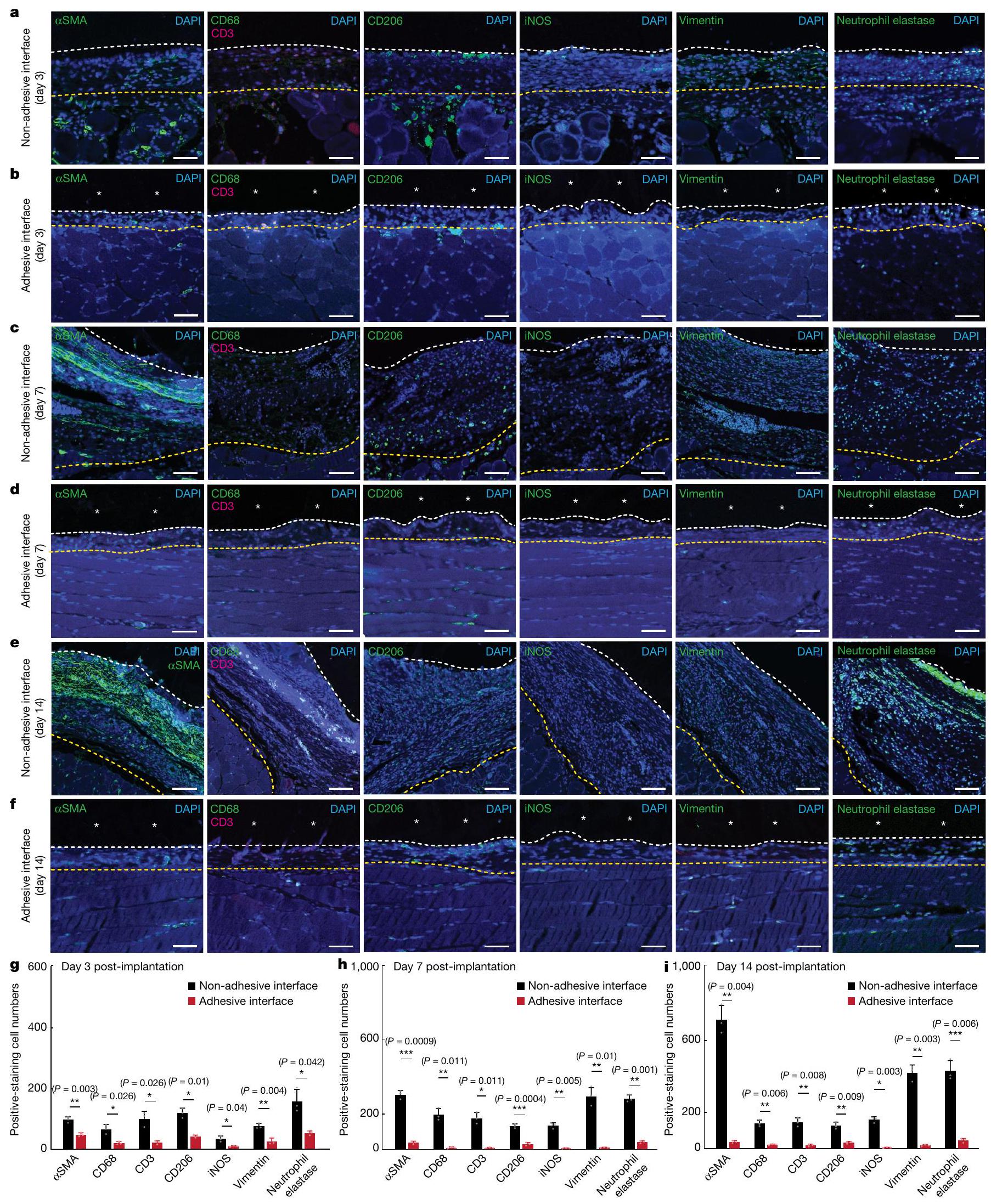 لتحقيق في تسلل خلايا المناعة إلى واجهة الأنسجة المزروعة، قمنا بإجراء صبغ مناعي فلوري للخلايا الليفية ( SMA)، العدلات (إيلاستاز العدلات)، البلعميات (CD68 للبلاعم العامة؛ iNOS وفيمينتين للبلاعم المؤيدة للالتهاب؛ CD206 للبلاعم المضادة للالتهاب) وخلايا T (CD3) في الأيام 3 و7 و14 بعد الزرع (الشكل 3a-f). قياس عدد الخلايا في الطبقة الكولاجينية عند واجهة نسيج الزرع على عرض تمثيلي منتظهر صور المناعة الفلورية عددًا أقل بكثير من الألياف، والعدلات، والبلاعم، وخلايا T عند واجهة زرع الأنسجة اللاصقة مقارنةً بواجهة زرع الأنسجة غير اللاصقة في جميع النقاط الزمنية (الشكل 3g-i).