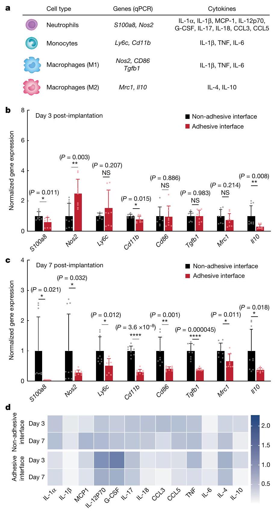 شكل. وتحليل Luminex لواجهات الأنسجة المزروعة اللاصقة وغير اللاصقة. أ، الجينات والسيتوكينات ذات الصلة بكل نوع من الخلايا في دراسات qPCR وLuminex. ب، ج، التعبير الجيني المنظم لمؤشرات الخلايا المناعية للواجهة المزروعة غير اللاصقة والواجهة المزروعة اللاصقة التي تم جمعها في اليوم الثالث (ب) واليوم السابع (ج) بعد الزرع على جدار البطن. د، خريطة حرارية للسيتوكينات المتعلقة بالخلايا المناعية التي تم قياسها باستخدام اختبار Luminex لواجهات الأنسجة المزروعة غير اللاصقة واللاصقة التي تم جمعها في اليومين الثالث والسابع بعد الزرع على جدار البطن. القيم في ب، ج تمثل المتوسط والانحراف المعياري.زراعة؛ نسخ بيولوجية مستقلة). الدلالة الإحصائية وتم تحديد القيم بواسطة اختبار غير متزاوج ذو جانبين-اختبارات؛ غير دالة، غير ذات دلالة؛; .