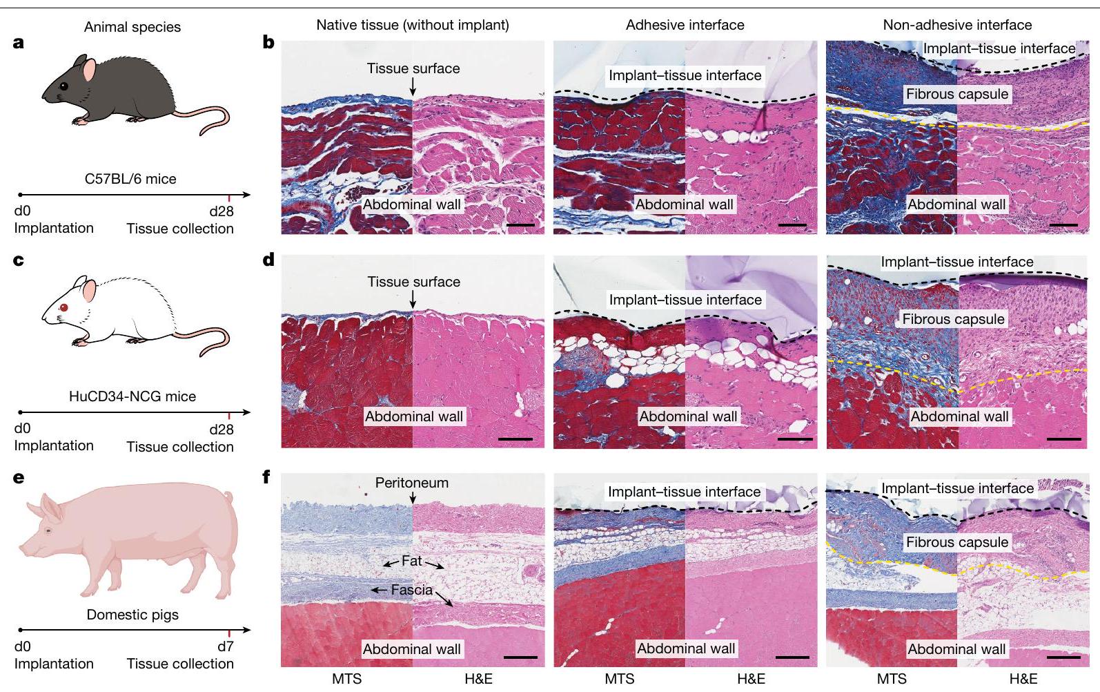 بعد ذلك، قمنا بإجراء تسلسل RNA الشامل لواجهات زرع جدار البطن لكل من الزرعات اللاصقة وغير اللاصقة في اليومين 3 و14 بعد الزرع للتحقيق بشكل أكبر في اختلافات التعبير الجيني (الشكل البياني الممتد 8). تُظهر تحليل المكونات الرئيسية تكتلًا منفصلًا للعينات لواجهات الأنسجة للزرعات غير اللاصقة واللاصقة في كل نقطة زمنية، مما يشير إلى ملفات تعريف نسخ متميزة (الشكل البياني الممتد 8a، d). يكشف تحليل التعبير الجيني التفاضلي للزرع اللاصق مقارنةً بواجهة الأنسجة للزرع غير اللاصق عن 40 جينًا تم تقليل تعبيرها و33 جينًا تم زيادة تعبيرها في اليوم الثالث بعد الزرع (الأشكال البيانية الممتدة 8b و9a). في اليوم الرابع عشر بعد الزرع، تم تقليل تعبير 357 جينًا وزيادة تعبير 156 جينًا (الأشكال البيانية الممتدة 8e و9b) في واجهة الأنسجة للزرع اللاصق مقارنةً بواجهة الأنسجة للزرع غير اللاصق. في اليوم الثالث بعد الزرع، يتم تعزيز تنظيم إنتاج الإنترفيرون وتطوير أنسجة العضلات المخططة في واجهة الأنسجة للزرع غير اللاصق، مما يشير إلى عمليات التهابية وتليف، بينما يتم تعزيز عمليات تكاثر الخلايا والنمو في واجهة الأنسجة للزرع اللاصق (الشكل البياني الممتد 8c). في اليوم الرابع عشر بعد الزرع، تكون العمليات المرتبطة بالتليف غنية جدًا في واجهة الأنسجة للزرع غير اللاصق، مثل تمايز خلايا العضلات، وتجميع الألياف العضلية، وتطوير هيكل العضلات، بينما يتم تعزيز تشكيل الأوعية الدموية، وتكوين الأعصاب، والتكاثر في واجهة الأنسجة للزرع اللاصق (الشكل البياني الممتد 8f). تشير هذه النتائج مرة أخرى إلى استجابة التهابية مخفضة وحل سريع للالتهاب في واجهة الأنسجة للزرع اللاصق مقارنةً بواجهة الأنسجة للزرع غير اللاصق. لاختبار فرضيتنا في نماذج حيوانية متنوعة، قمنا بزرع الغرسات اللاصقة وغير اللاصقة على سطح جدار البطن لفئران C57BL/6 المناعية الكاملة وفئران HuCD34-NCG البشرية. فئران (الشكل 5أ، ج). لاحظ أن فئران C57BL/6 المناعية المعتمدة معروفة بإنتاج التليف وتفاعلات الجسم الغريب المشابهة لتلك التي لوحظت في المرضى البشر.وتمكن فئران HuCD34-NCG المحورة لتكون بشرية من تقديم استجابات مناعية مشابهة للبشرتظهر التحليلات النسيجية أن واجهة زرع الأنسجة اللاصقة لا تظهر أي تشكيل ملحوظ للكبسولة الليفية، مقارنةً بالأنسجة الأصلية في اليوم 28 بعد الزرع في كل من نماذج الفئران C57BL/6 (الشكل 5ب) وHuCD34-NCG (الشكل 5د). بالمقابل، تظهر واجهة زرع الأنسجة غير اللاصقة تشكيلًا كبيرًا للكبسولة الليفية في كلا النموذجين (الشكل 5ب، د).