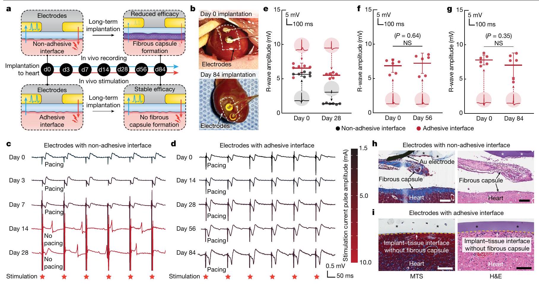 لاستكشاف الفائدة المحتملة للواجهات اللاصقة المضادة للتليف، أظهرنا تسجيلًا وتحفيزًا كهربائيًا في الجسم الحي على المدى الطويل باستخدام الأقطاب الكهربائية القابلة للزراعة مع الواجهة اللاصقة في نموذج الفئران لمدة 84 يومًا (الشكل 6). من أجل المراقبة المستمرة في الجسم الحي وتعديل تخطيط القلب الكهربائي، تم زراعة الأقطاب الكهربائية مع الواجهة اللاصقة أو غير اللاصقة على السطح الخارجي للقلب للحيوانات من أجل التسجيل الكهربائي و
