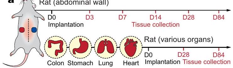 تم زرع كل من الغرسات اللاصقة وغير اللاصقة على أسطح أعضاء متنوعة، بما في ذلك جدار البطن، والقولون، والمعدة، والرئة، والقلب، باستخدام نماذج من الجرذان في الجسم الحي لمدة تصل إلى 84 يومًا (الشكل 1e-i). لاحظ أن الغرسة غير اللاصقة تم خياطتها على أسطح الأعضاء. أظهرت الملاحظات الماكروسكوبية أن كل من الغرسات اللاصقة وغير اللاصقة ظلت مستقرة في موقع الزرع على أسطح الأعضاء (بيانات موسعة الشكل 1b,c). لتحليل رد الفعل تجاه الجسم الغريب وتكوين الكبسولة الليفية للغرسات اللاصقة وغير اللاصقة، قمنا بإجراء تحليل نسيجي للأنسجة الأصلية، والغرسة اللاصقة، والغرسة غير اللاصقة لمختلف الأعضاء (بيانات موسعة الشكل 1a).