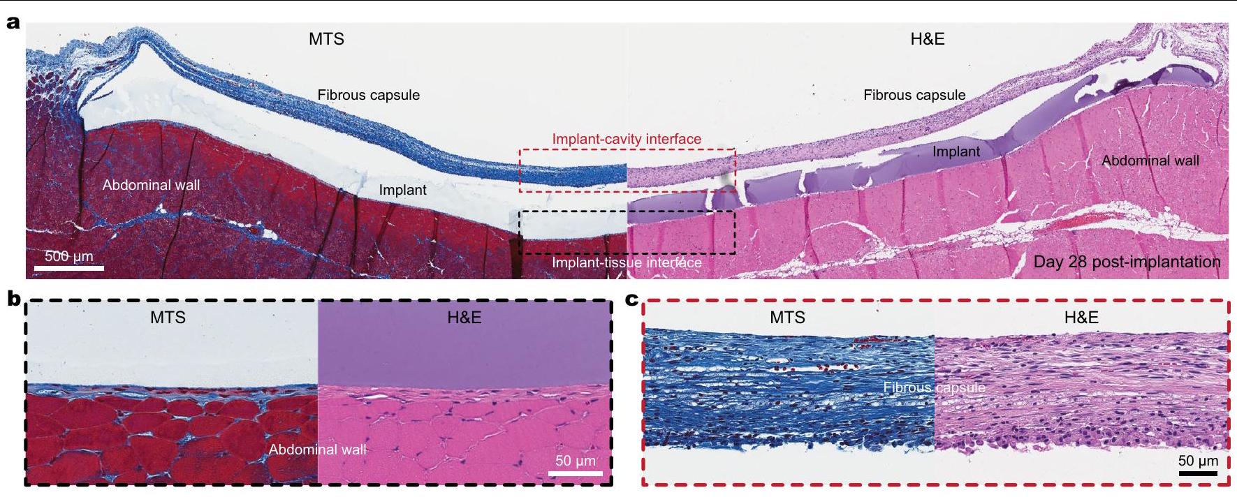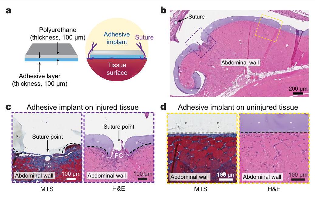 trichrome (MTS, left) and H&E (right) for the suture point (c) and the intact adhesive-tissue interface (d) collected on day 28 post-implantation to the abdominal wall.*In images indicates the implant; black dotted lines indicate the implant-tissue interface. FC, fibrous capsule. The experiment in b-d was repeated independently ( ) with similar results.
