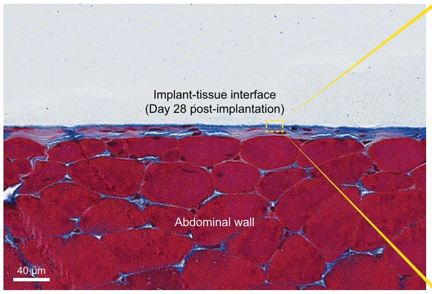Extended Data Fig. 3 | TEM image of the adhesive implant-tissue interface. Representative histology image stained with Masson’s trichrome (left) and TEM image (right) of the adhesive implant collected on day 28 post-implantation to