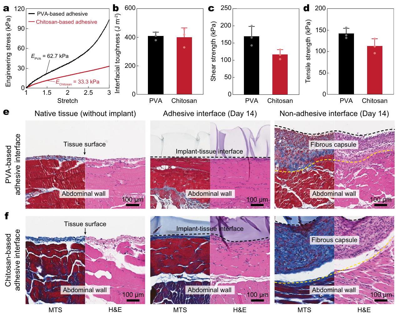 non-adhesive implant (right) collected on day 14 post-implantation to the abdominal wall based on the PVA-based adhesive interface (e) and the chitosan-based adhesive interface (f). Black and yellow dotted lines in the images indicate the implant-tissue interface and the fibrous capsule-tissue interface, respectively. Values in b-d represent the mean and the standard deviation ( , independent samples). The experiment in was repeated independently ( per group) with similar results.