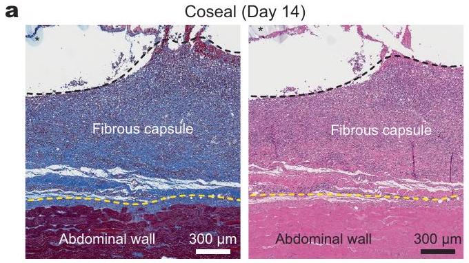 Extended Data Fig. Adhesive interface by commercially-available tissue adhesives. a,b, Representative histology images stained with Masson’s trichrome (left) and haematoxylin and eosin (right) for the implant integrated to the abdominal wall surface by Coseal (a) and Tisseel (b) collected on day 14 post-implantation.*In images indicates the implant; black dotted lines indicate the implant-tissue interface; yellow dotted lines indicate the fibrous capsuletissue interface. The experiment was repeated independently ( per group) with similar results.
