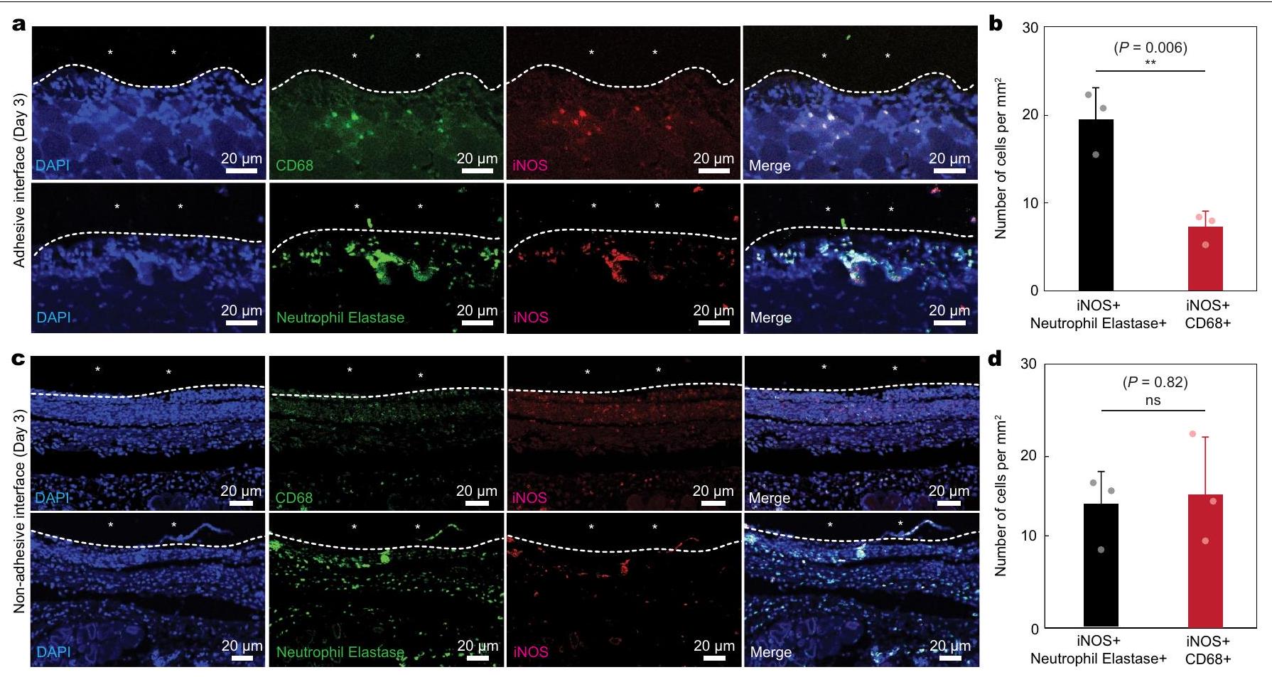 interface. In immunofluorescence images, cell nuclei are stained with 4′,6-diamidino-2-phenylindole (DAPI, blue); green fluorescence corresponds to the expression of macrophage (CD68) and neutrophil (neutrophil elastase); red fluorescence corresponds to the expression of iNOS. *In images indicates the implant; white dotted lines in images indicate the implant-tissue interface. Values in b,d represent the mean and the standard deviation ( implants; independent biological replicates). Statistical significance and values are determined by two-sided unpaired -tests; ns, not significant; .