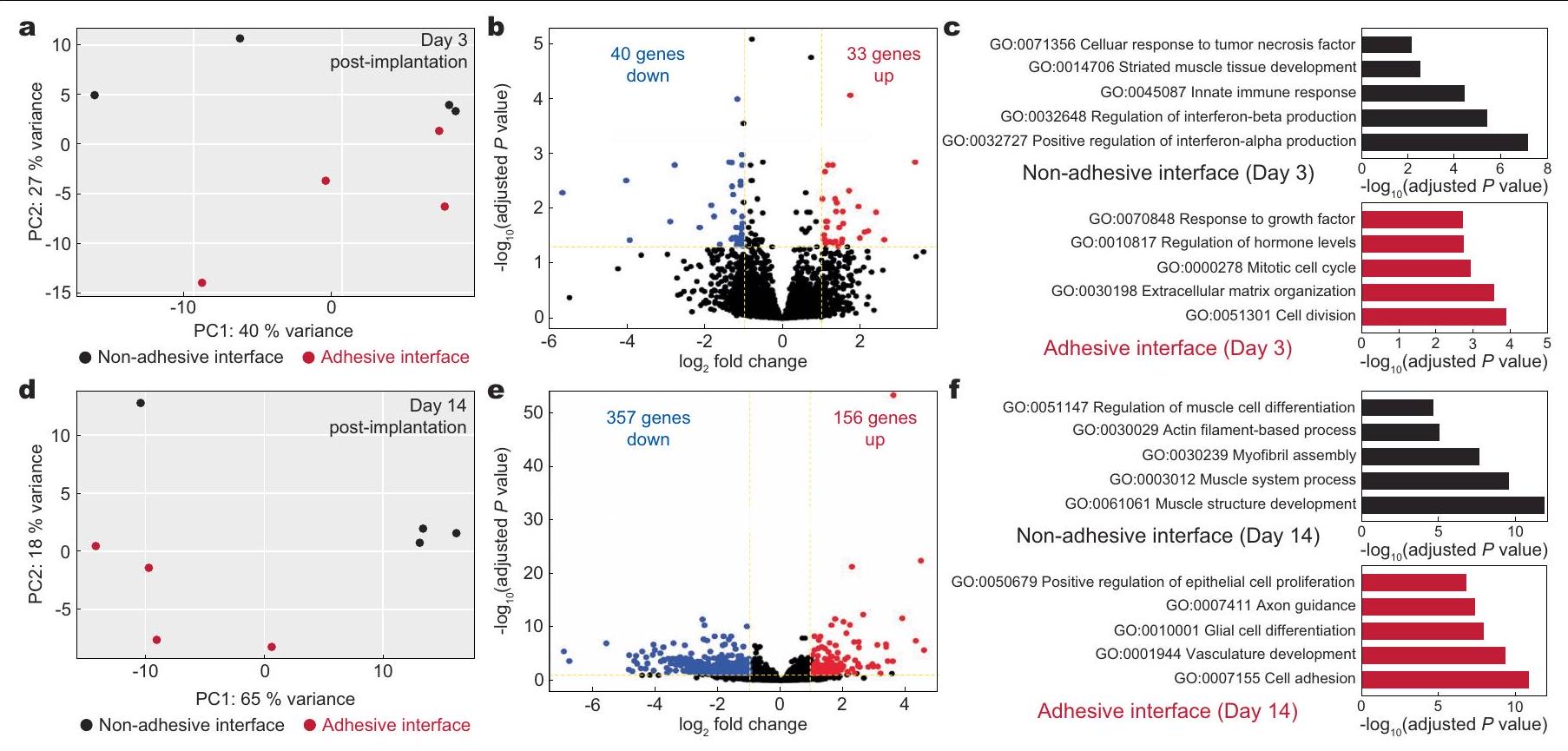 implantation to the abdominal wall.d, PCA plot illustrating the variances of the adhesive (red dots, ) and non-adhesive (black dots, ) implant-tissue interface dataset collected on day 14 post-implantation to the abdominal wall. e, Volcano plot displaying the gene expression profiles for the non-adhesive and adhesive implant-tissue interfaces collected on day 14 post-implantation to the abdominal wall. Coloured (blue and red) data points represent genes that meet the threshold of fold change (FC) above 1 or under -1 , false discovery rate . Blue and red coloured dots indicate down- and up-regulated genes in the adhesive implant-tissue interface compared to the non-adhesive implant-tissue interface, respectively. , Top five enriched processes from Gene Ontology(GO) enrichment analysis of differentially expressed genes in the non-adhesive (black) and adhesive (red) implant-tissue interfaces collected on day 14 post-implantation to the abdominal wall. The values were determined by one-sided Fisher’s exact test and adjusted by Storey’s correction method.